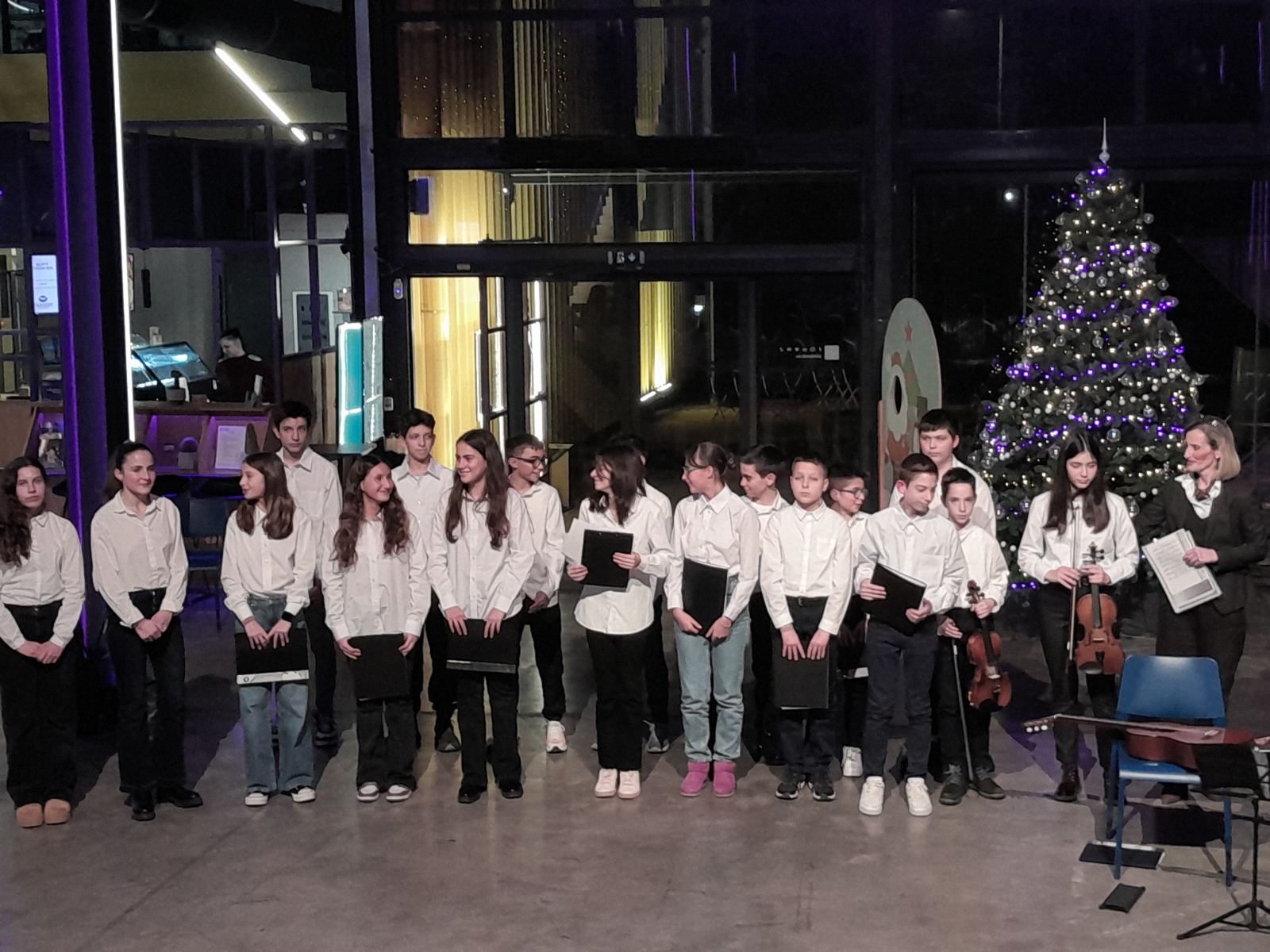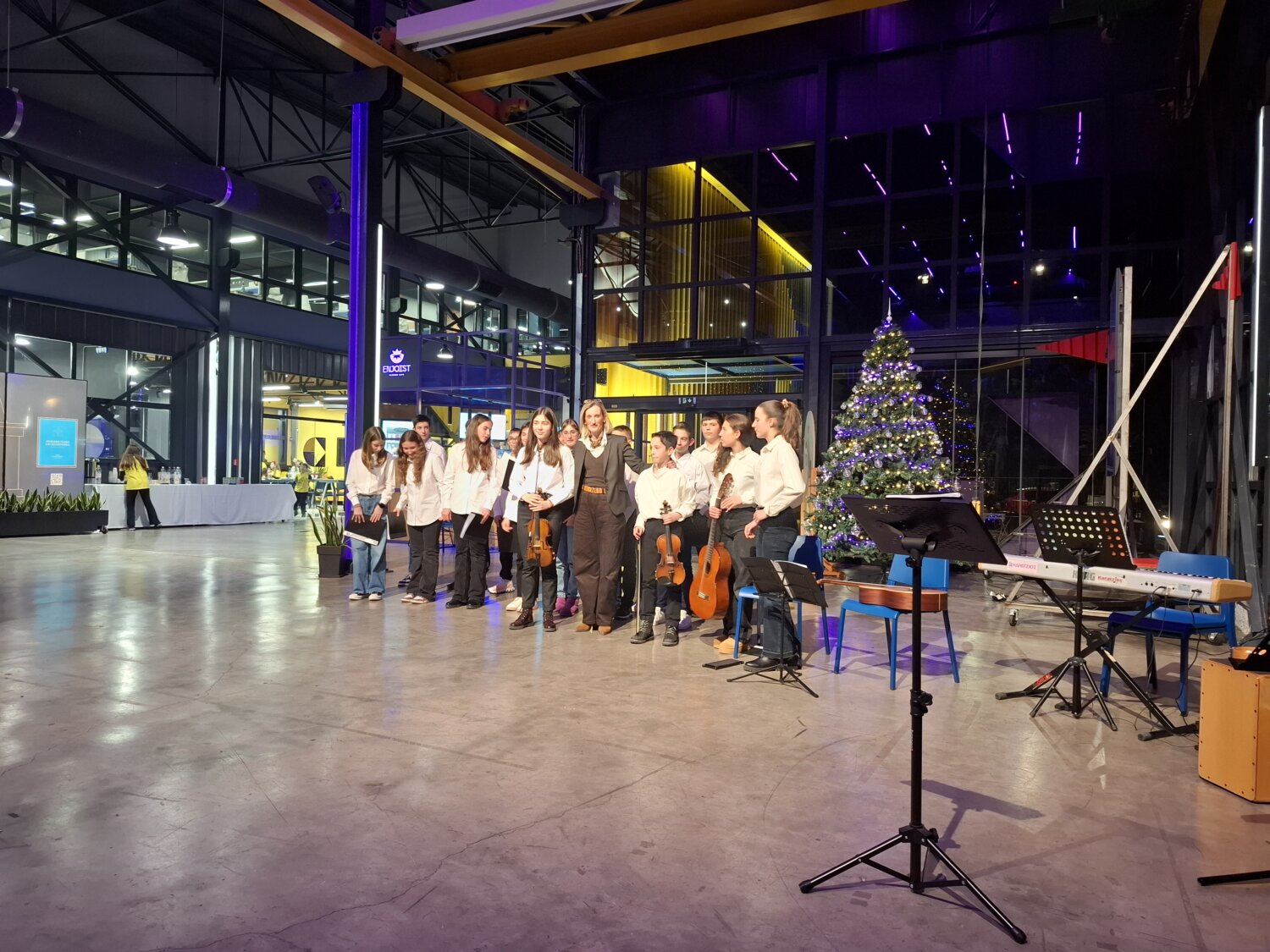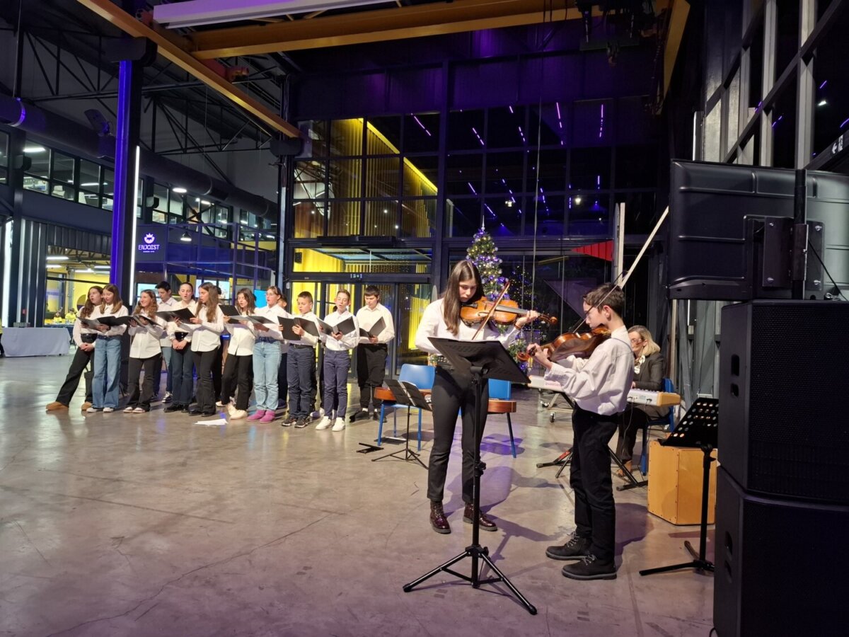 Μέσα σε κλίμα χαράς και συγκίνησης, ο Όμιλος Μουσικής Τέχνης του Προτύπου Γυμνασίου Λάρισας συμμετείχε στη χριστουγεννιάτικη εκδήλωση που διοργανώθηκε από το Πάρκο Καινοτομίας JOIST την Πέμπτη 18 Δεκεμβρίου το απόγευμα. Οι μαθητές και οι μαθήτριες του Ομίλου παρουσίασαν με ενθουσιασμό με τη συνοδεία πιάνου, βιολιού και κιθάρας  αγαπημένα χριστουγεννιάτικα τραγούδια από την ελληνική και διεθνή μουσική παράδοση, γεμίζοντας τον χώρο με γιορτινές μελωδίες και ζεστά συναισθήματα. Το κοινό αγκάλιασε την προσπάθειά τους με θερμό χειροκρότημα, ανταποδίδοντας τη χαρά που απλόχερα πρόσφεραν.