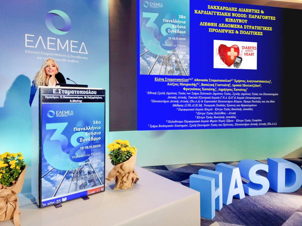 Σημαντική υπήρξε η Επιστημονική Παρουσία της Υποψήφιας Διδάκτωρ κα Ελένης Σταματοπούλου, PhDc Πανεπιστήμιο Δυτικής Αττικής-Τμήμα Βιοϊατρικών Επιστημών, MSc Εθνικής Σχολής Δημόσιας Υγείας νυν Τμήμα Πολιτικών Δημόσιας Υγείας Σχολής Δημόσιας Υγείας του Πανεπιστημίου Δυτικής Αττικής, MSc Διοίκηση Μονάδων Υγείας & Κοινωνικής Πρόνοιας Πανεπιστήμιο Δυτικής Αττικής & Ευρωπαϊκό Πανεπιστήμιο Κύπρου, Λειτουργός Δημόσιας Υγείας, Εκπαιδευτικός Ίδρυμα Νεολαίας και Δια Βίου Μάθησης (Ι.ΝΕ.ΔΙ.ΒΙ.Μ), Υπουργείο Παιδείας Έρευνας και Θρησκευμάτων, Ελληνική Διατροφολογική Εταιρεία (ΕΛ.Δ.Ε.) & ΕΚΑΒ, Ακαδημαϊκή Υπότροφός Πα.Δ.Α., RN Γ.Ν.Α. ΚΑΤ, Τακτικά Εξωτερικά Ιατρεία Τ.Ε.Ι. Γ.Ν.Α. ΚΑΤ & Ιατρείο Οστεοπόρωσης, Μέλος Ελληνικής Εταιρείας Εσωτερικής Παθολογίας, Member PCRS-UK, στο πλαίσιο του 38ου Πανελλήνιου Ετήσιου Συνεδρίου της Ελληνικής Εταιρείας Μελέτης και Εκπαίδευσης (ΕΛ.Ε.Μ.Ε.Δ.), το οποίο πραγματοποιήθηκε στη Θεσσαλονίκη, καθώς με Ενεργό Επιστημονική και Διαδραστική Συμμετοχή ανέδειξε ερευνητικά ευρήματα και αποτελέσματα μελετών στα πλαίσια του άψογα διοργανωμένου Συνεδρίου της ΕΛ.Ε.Μ.Ε.Δ., συμβάλλοντας ουσιαστικά στο άρτια οργανωμένο επιστημονικό πρόγραμμα του Συνεδρίου με την ανάδειξη των παρακάτω ενδιαφέρουσων επιστημονικών εργασιών: Σακχαρώδης Διαβήτης και Καρδιαγγειακή Νόσος: Παράγοντες Κινδύνου Διεθνή Δεδομένα Στρατηγικές Πρόληψης και Πολιτικές με υπόλοιπους συμμετέχοντες την κα. Αθανασία Σταματοπούλου2,7, τον κ. Χρήστο Αναγνωστόπουλο3, τον κ. Αλέξιο Μαυρουδή4,7, την κα. Βασιλική Γιαννιώτη5, την κα. Δροσιά Μουλατζίδου6, τον κ. Φραγκίσκο Χανιώτη7 και τον Δημήτριο Χανιώτη7 από τα αντίστοιχα κέντρα προέλευσης: 2Πανεπιστήμιο Δυτικής Αττικής (Πα.Δ.Α) & Ευρωπαϊκό Πανεπιστήμιο Κύπρου, Ίδρυμα Νεολαίας και Δια Βίου Μάθησης (Ι.ΝΕ.ΔΙ.ΒΙ.Μ), Υπουργείο Παιδείας Έρευνας και Θρησκευμάτων, 3 Περιφερειακό Ιατρείο Βλυχού – Κέντρο Υγείας Βασιλικής Λευκάδας, 4 Κέντρο Υγείας Καλλιθέας – Αττική, 5 Κέντρο Υγείας Βασιλικής Λευκάδας , 6 Πολυδύναμο Περιφερειακό Ιατρείο Φερών Νομός Έβρου – Κέντρο Υγείας Σουφλίου, 7 Τμήμα Βιοϊατρικών Επιστημών, Σχολή Επιστημών Υγείας και Πρόνοιας, Πανεπιστήμιο Δυτικής Αττικής (Πα.Δ.Α.) και προεδρείο τον κ. Π. Παπαοικονόμου, Παθολόγο – Διαβητολόγο Θεσσαλονίκη, τον κ. Μ. Παζαρλόγλου Νεφρολόγο-Παθολόγο, Διδάκτωρ Ιατρικής ΔΠΘ, Θεσσαλονίκη, Επιστημονικός Υπεύθυνος Μονάδας Χρόνιας Αιμοκάθαρσης ΑΛΦΑ-Νεφροδυναμική, Κιλκίς και τον κ. Α. Μπένη Παθολόγο-Διαβητολόγο, Κλινική Θέρμη, Θεσσαλονίκη.