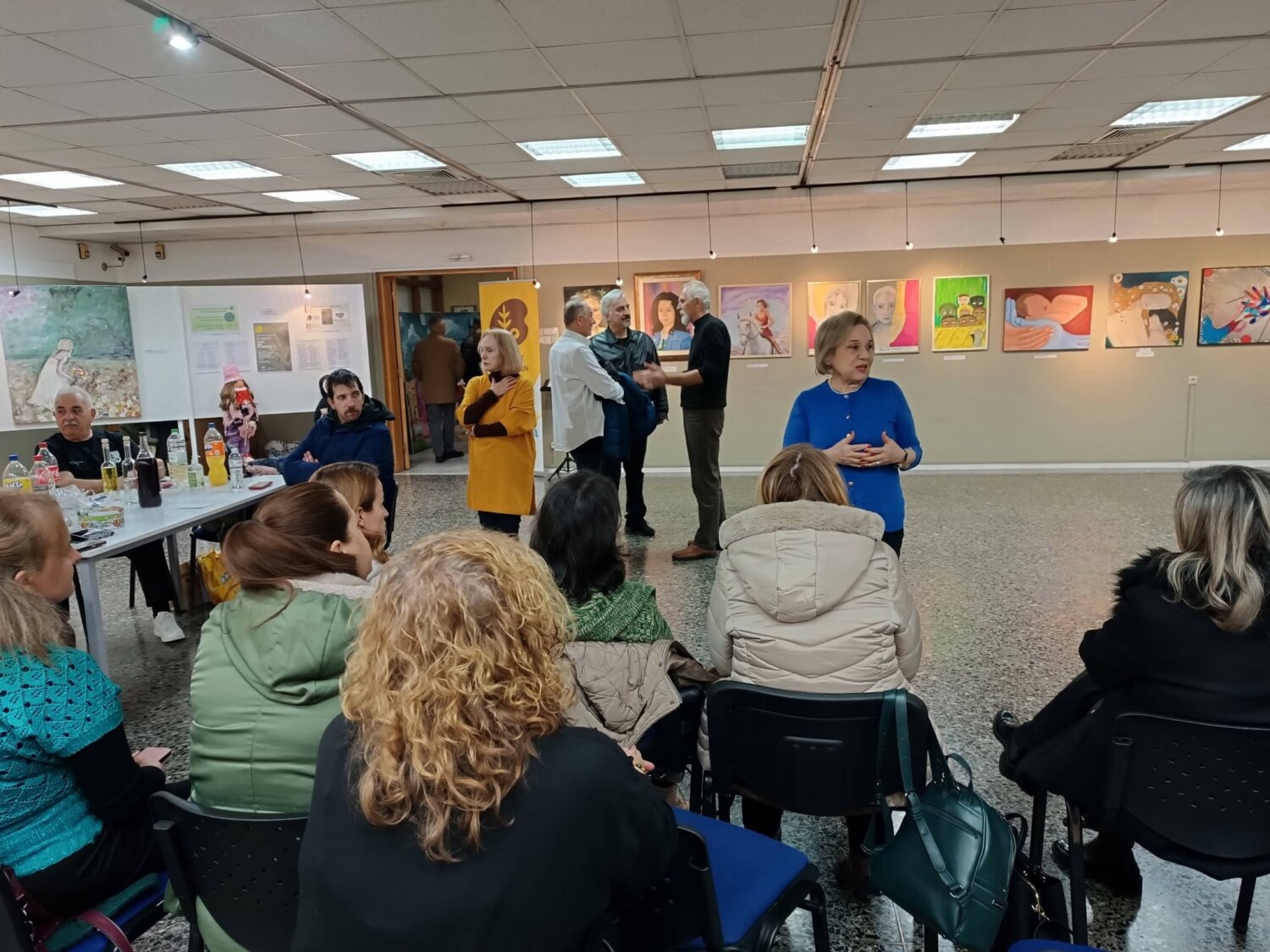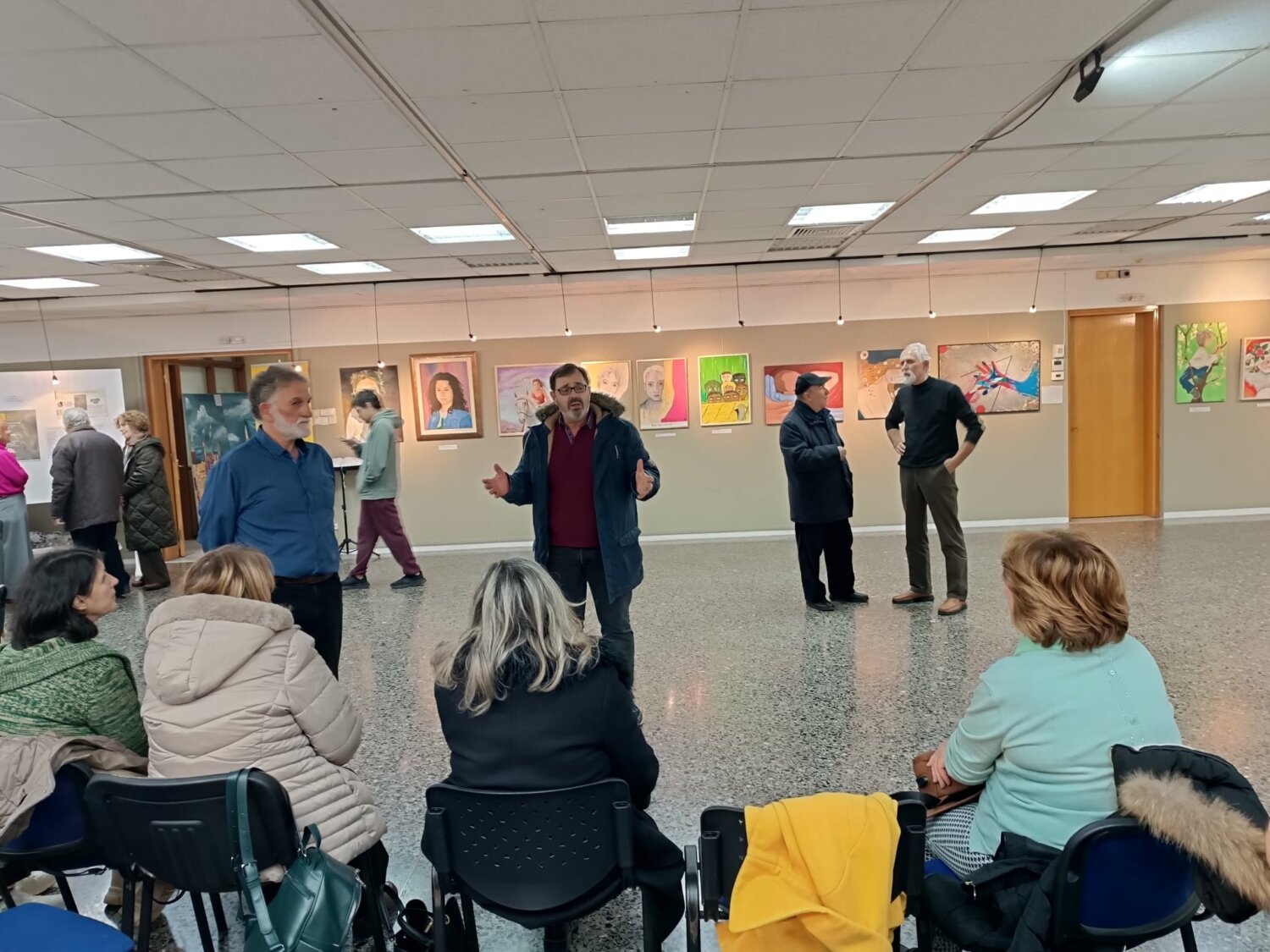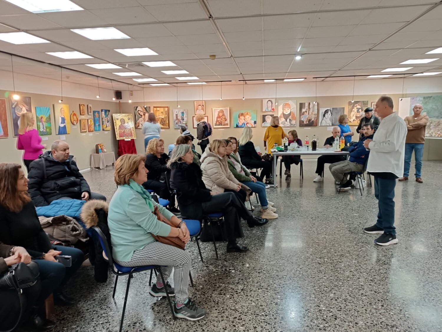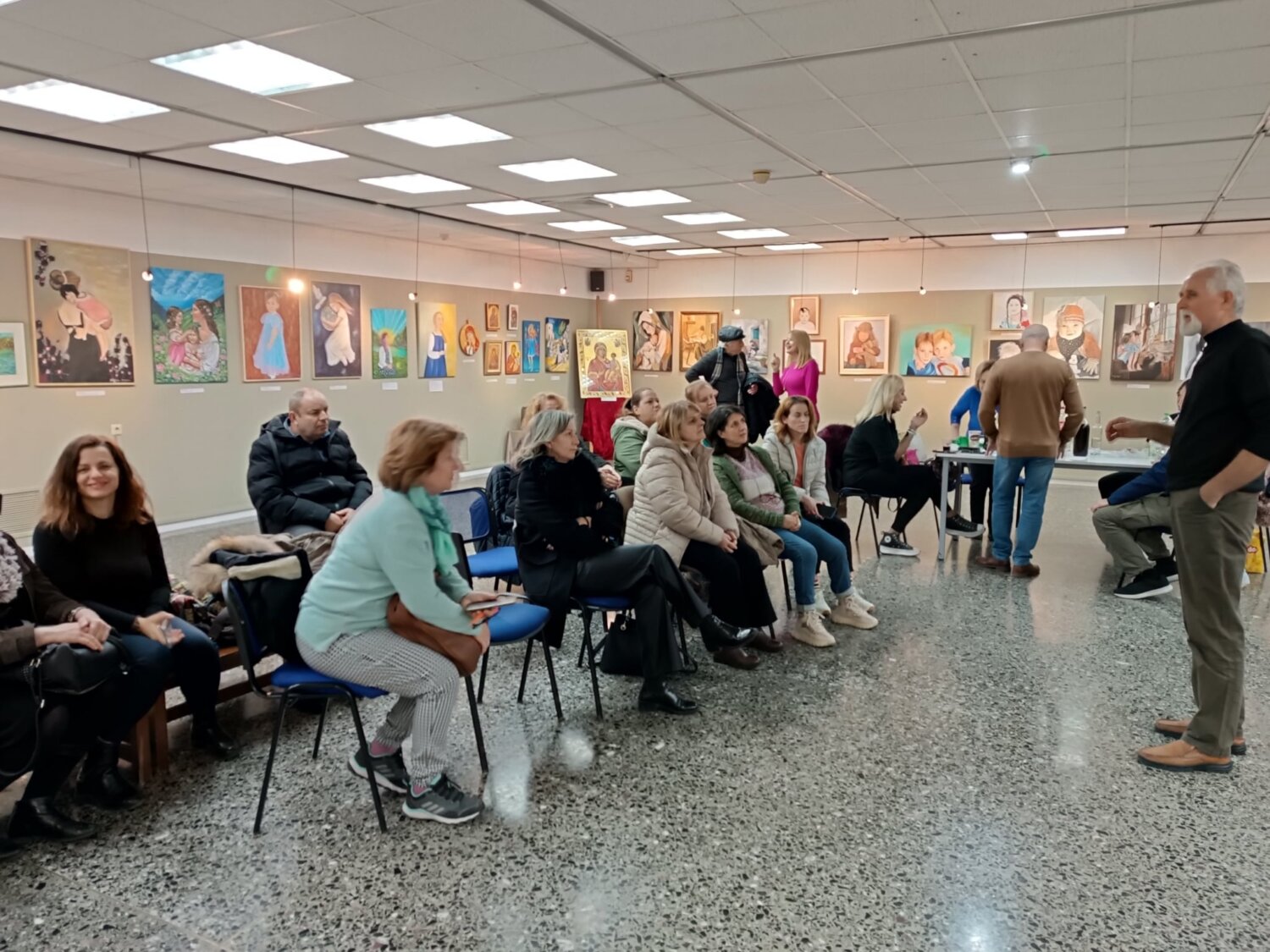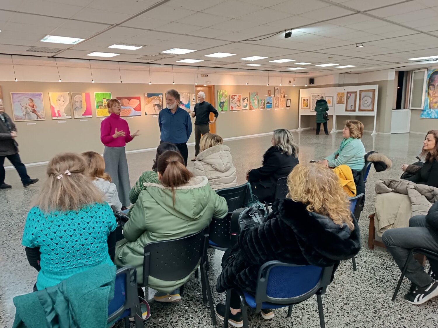 Αρχικά, ο Πρόεδρος του Συλλόγου Εικαστικών κ. Γιάννης Γεωργιάδης υποδέχτηκε τους εκπαιδευομένους και έκανε μια γενική εισήγηση για την όλη έκθεση. Στη συνέχεια, τους επισκέπτες ξενάγησαν στον χώρο κάποιοι από τους καλλιτέχνες, οι οποίοι ένας ένας χωριστά παρουσίασαν τα έργα τους, μίλησαν συνοπτικά για την έμπνευσή τους, τις τεχνοτροπίες που ακολούθησαν και τους χρωματικούς συνδυασμούς που χρησιμοποίησαν. Οι εκπαιδευόμενοι ενθουσιάστηκαν από τα έργα, έβγαλαν φωτογραφίες, συγχάρηκαν τους παριστάμενους καλλιτέχνες, ενώ έλυσαν πολλές απορίες τους με τη συζήτηση που είχαν μαζί τους.