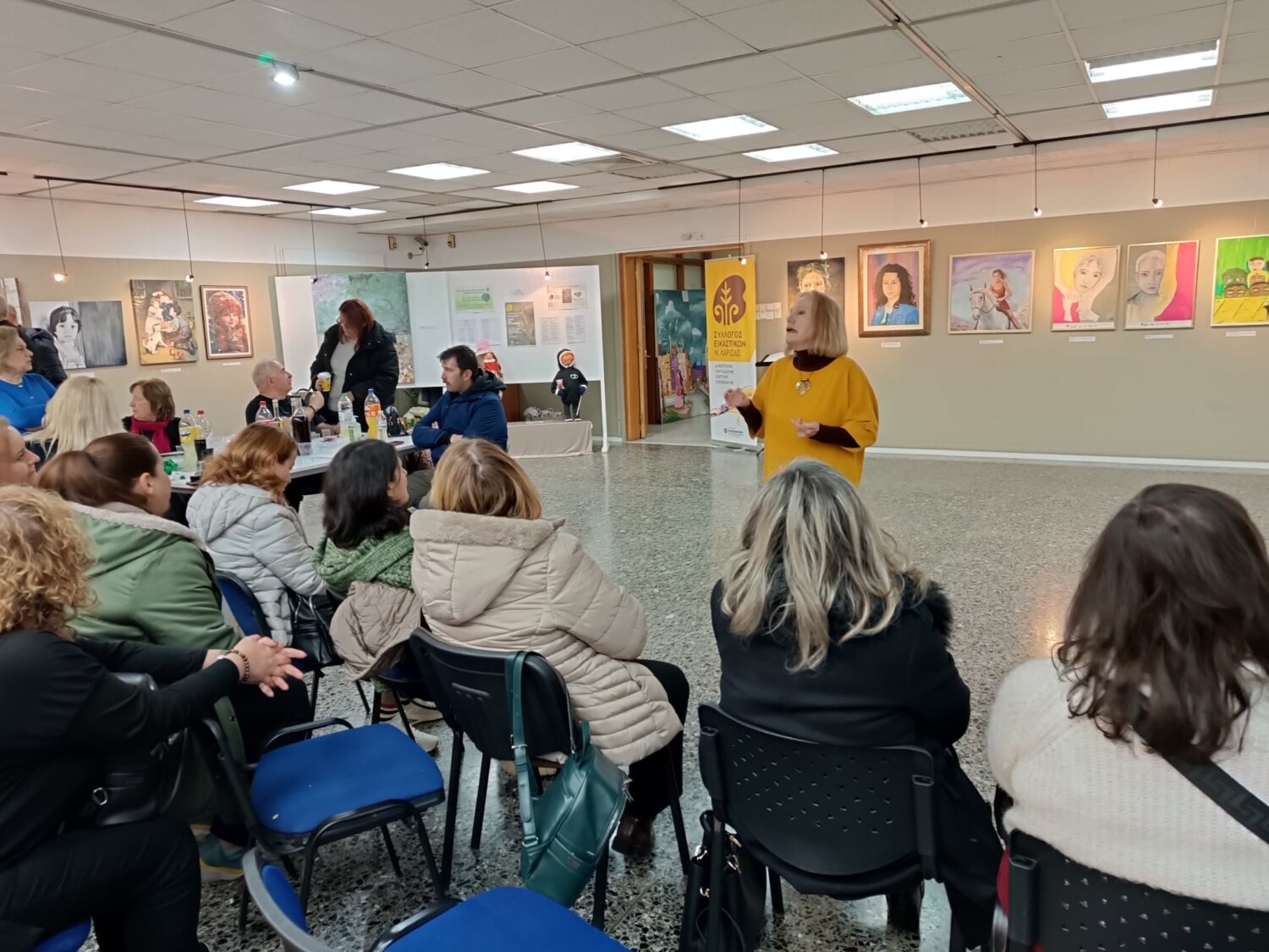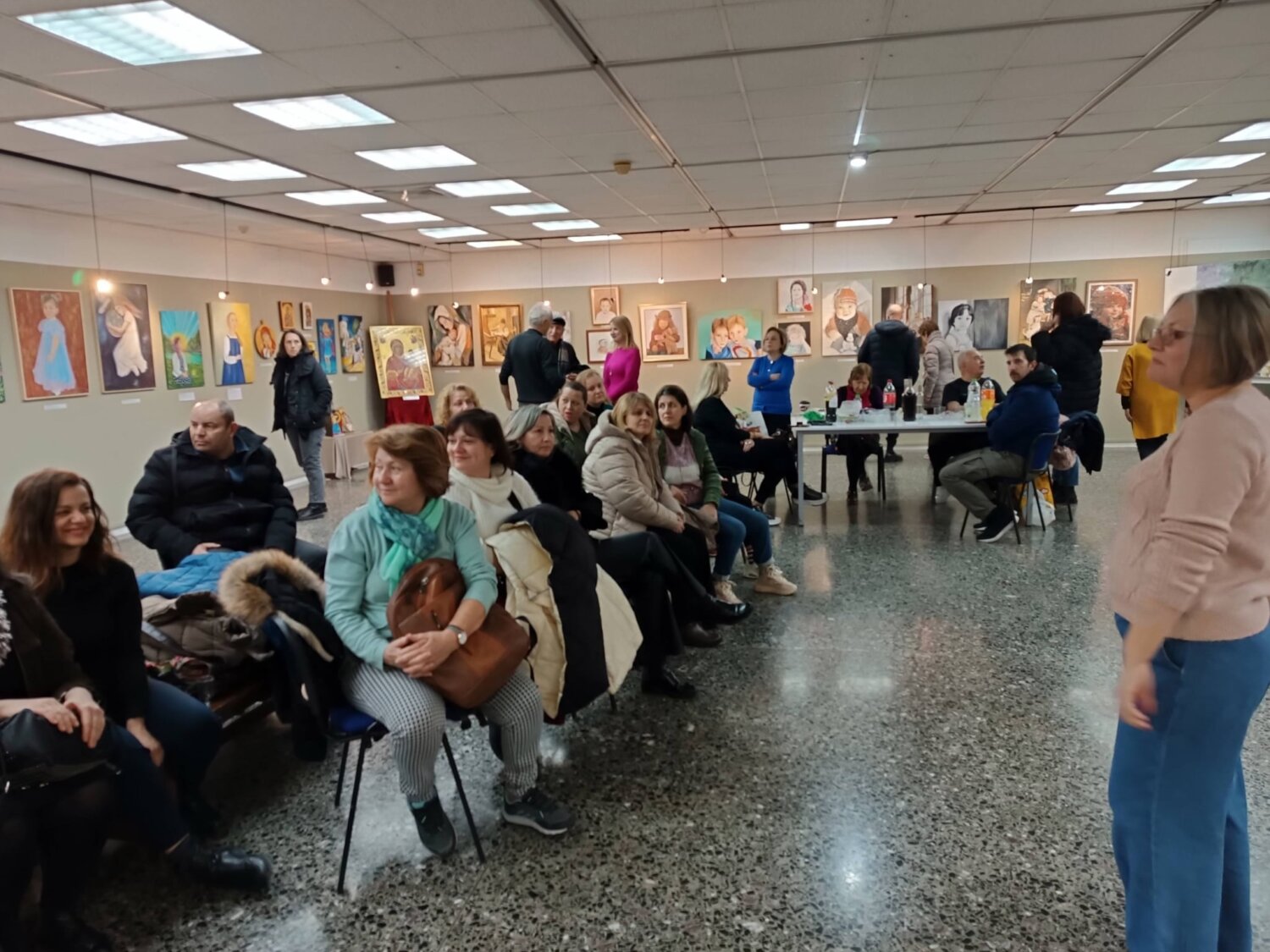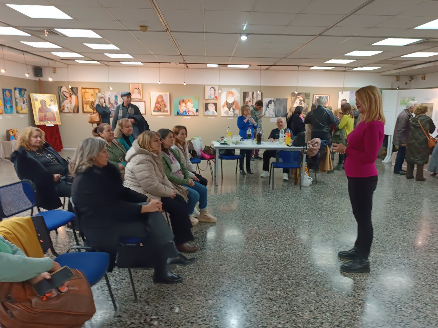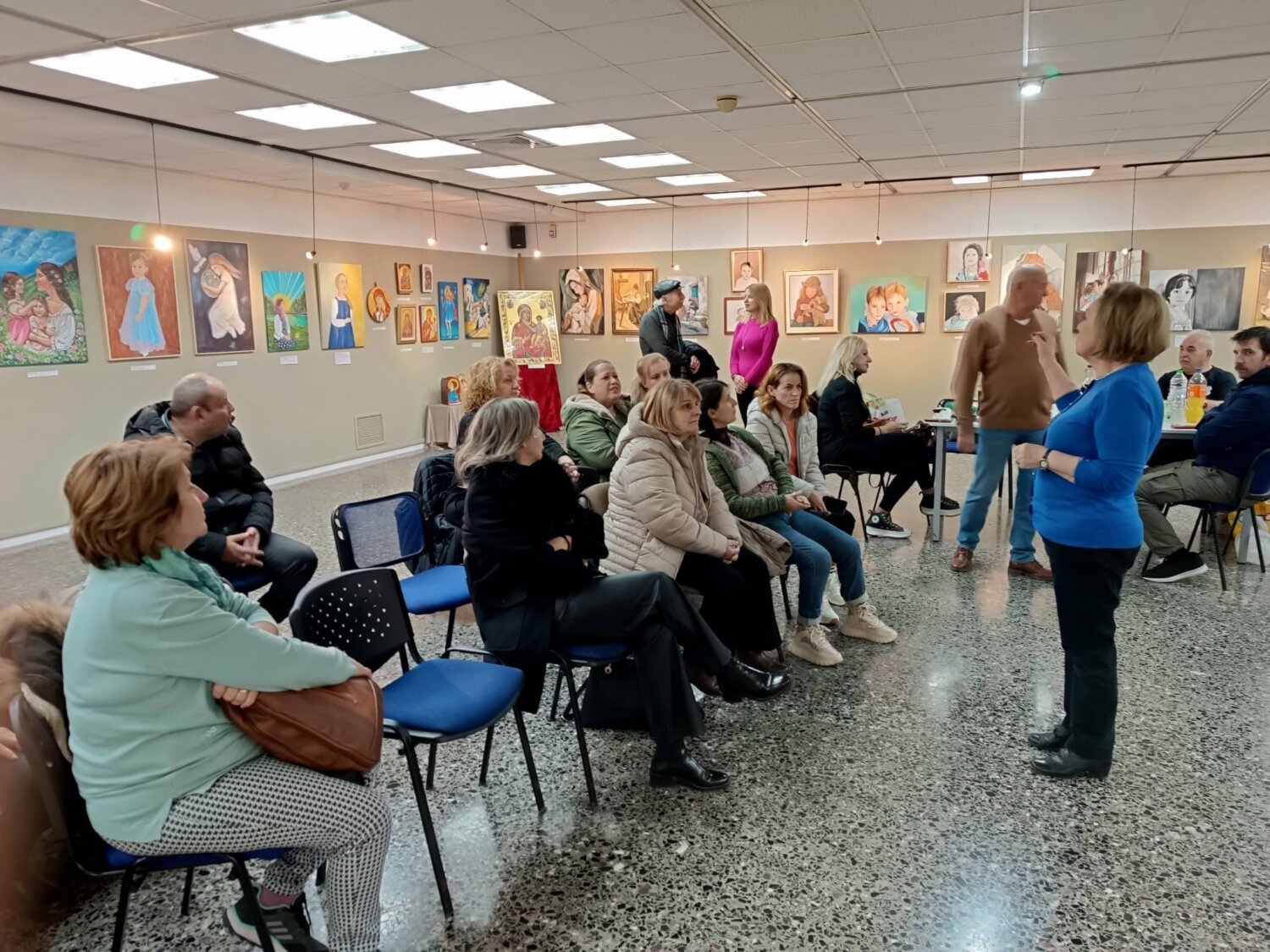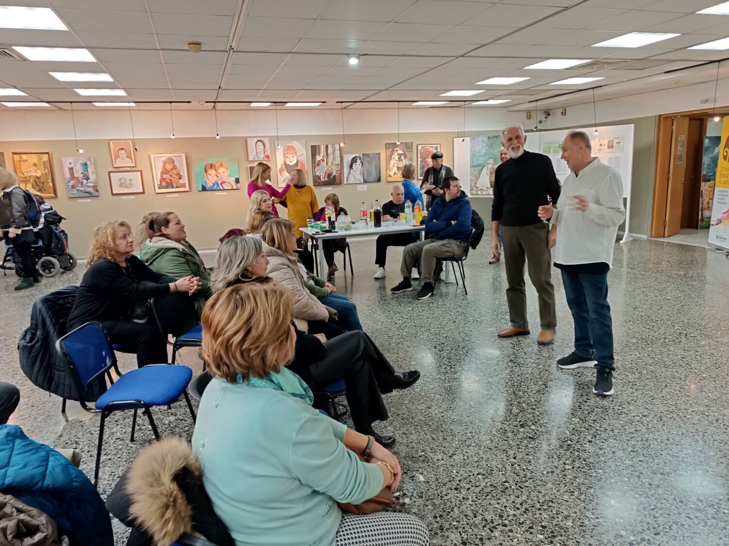 Αρχικά, ο Πρόεδρος του Συλλόγου Εικαστικών κ. Γιάννης Γεωργιάδης υποδέχτηκε τους εκπαιδευομένους και έκανε μια γενική εισήγηση για την όλη έκθεση. Στη συνέχεια, τους επισκέπτες ξενάγησαν στον χώρο κάποιοι από τους καλλιτέχνες, οι οποίοι ένας ένας χωριστά παρουσίασαν τα έργα τους, μίλησαν συνοπτικά για την έμπνευσή τους, τις τεχνοτροπίες που ακολούθησαν και τους χρωματικούς συνδυασμούς που χρησιμοποίησαν. Οι εκπαιδευόμενοι ενθουσιάστηκαν από τα έργα, έβγαλαν φωτογραφίες, συγχάρηκαν τους παριστάμενους καλλιτέχνες, ενώ έλυσαν πολλές απορίες τους με τη συζήτηση που είχαν μαζί τους.