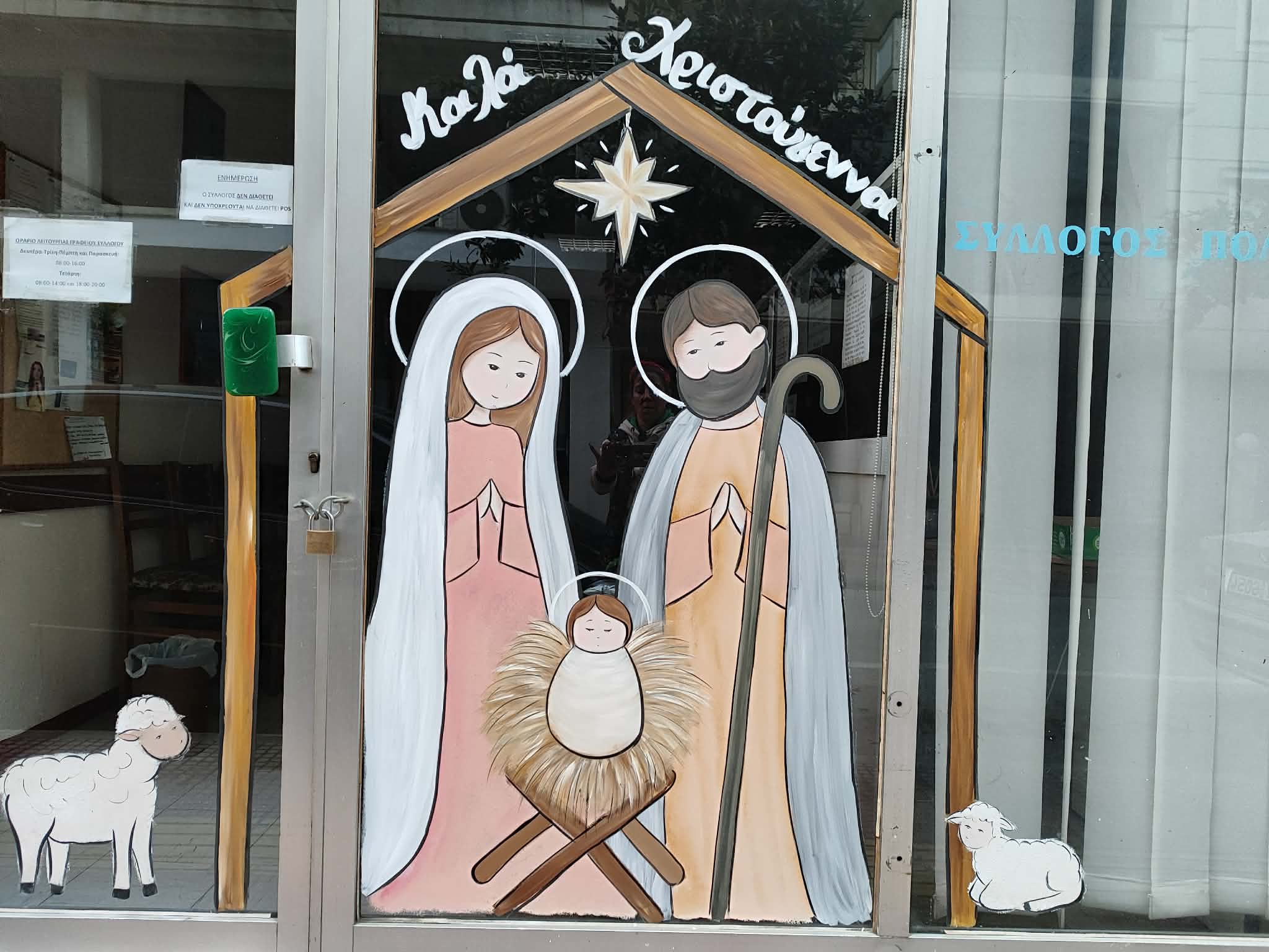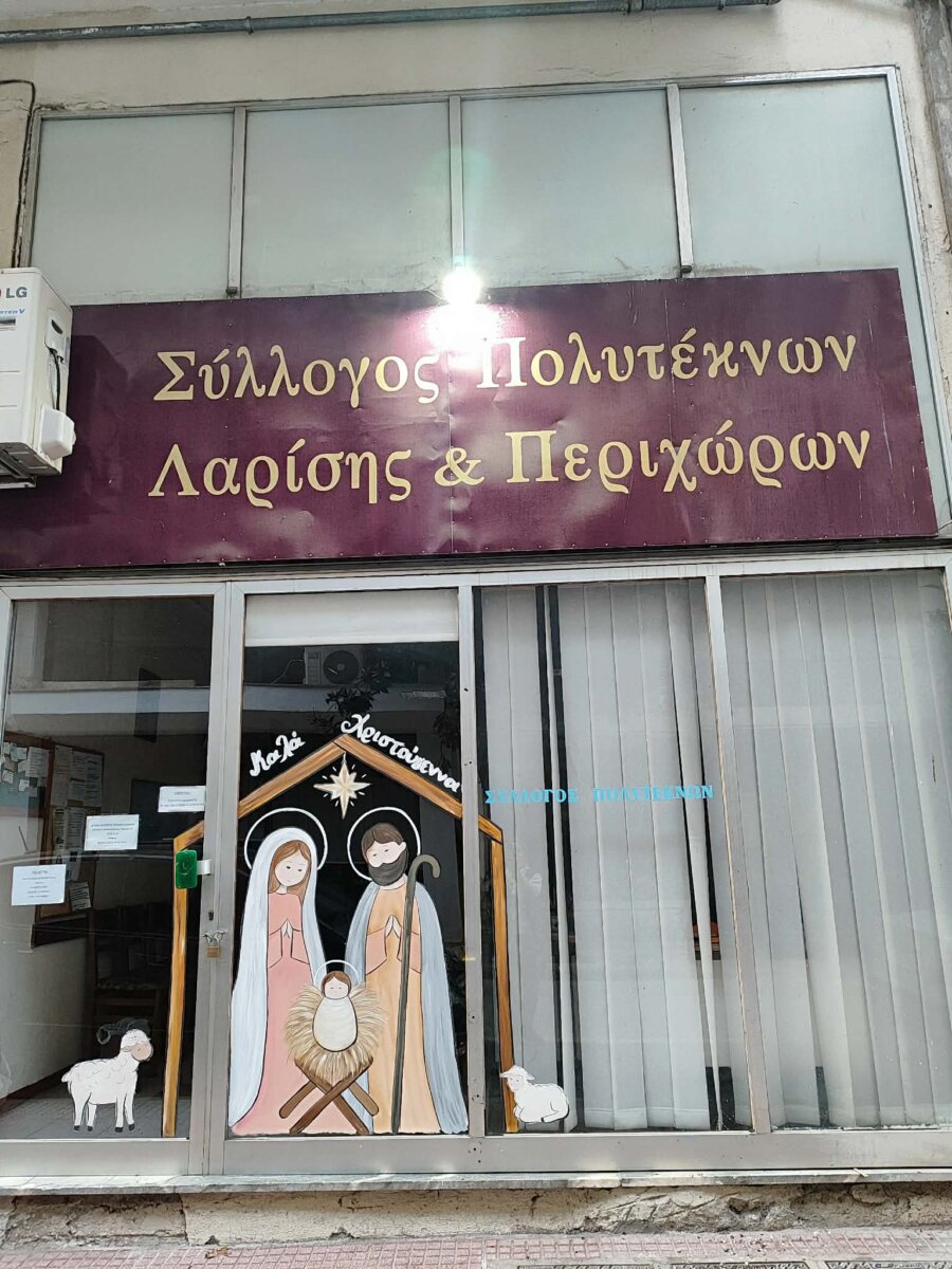 – Εντωμεταξύ, με Χριστουγεννιάτικη όψη υποδέχεται τα μέλη του ο Σύλλογος Πολυτέκνων Λάρισας και Περιχώρων. Τη ζωγραφική στη βιτρίνα του γραφείου μας ανέλαβε η εξαιρετική καλλιτέχνιδα και πολύτεκνη μητέρα Έλενα Τσόγκα.