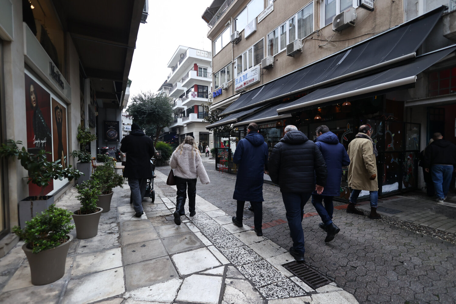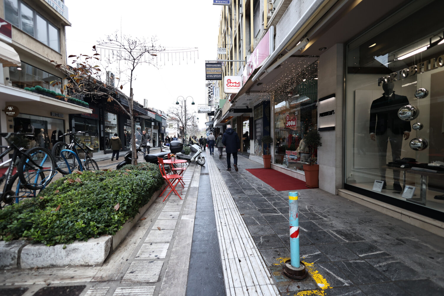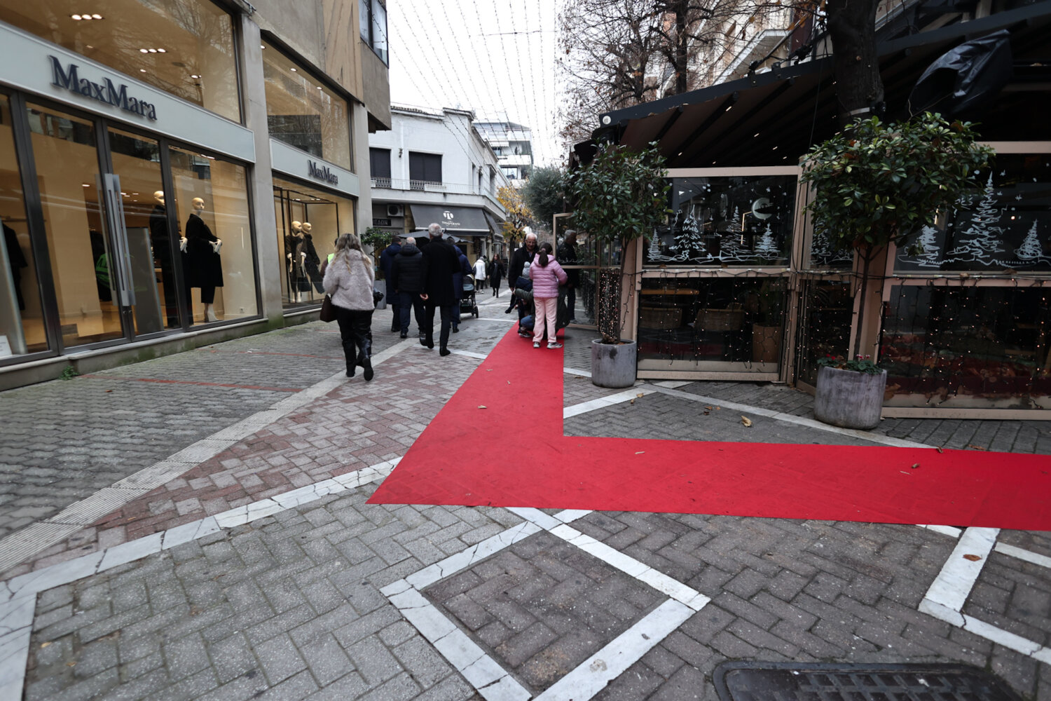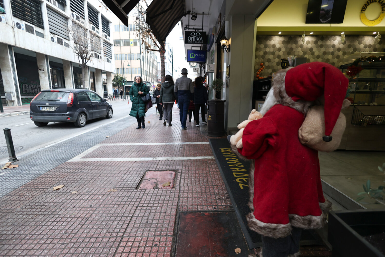 Ο στολισμός και τα φωτισμένα καταστήματα δημιουργούν μια ζωντανή και αισιόδοξη ατμόσφαιρα, ενώ ορισμένοι καταναλωτές εκμεταλλεύονται την κυριακάτικη λειτουργία της αγοράς.