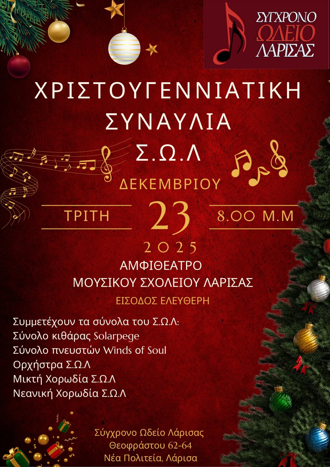 Το Σύγχρονο Ωδείο Λάρισας σας προσκαλεί με χαρά στην τελευταία Χριστουγεννιάτικη συναυλία των συνόλων του την Τρίτη 23 Δεκεμβρίου και ώρα 8.00 μ. μ. στο αμφιθέατρο του Μουσικού Σχολείου Λάρισας.