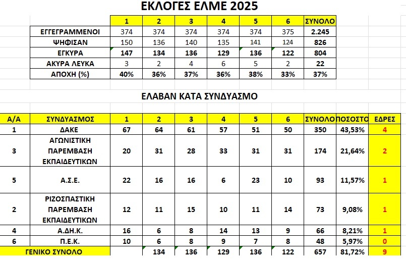 Με συμμετοχή που άγγιξε το 63% και συνολικά 826 ψηφίσαντες σε σύνολο 2.245 εγγεγραμμένων, ολοκληρώθηκαν οι εκλογές της ΕΛΜΕ για το 2025. Τα έγκυρα ψηφοδέλτια ανήλθαν σε 804, ενώ καταγράφηκαν 22 άκυρα και λευκά. Η συνολική αποχή διαμορφώθηκε στο 37%.