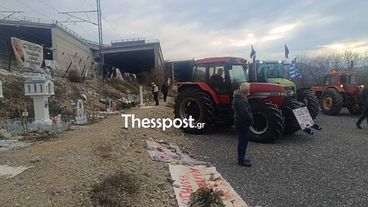 Σε μία κίνηση υψηλού συμβολισμού, οι αγρότες από το μπλόκο της Νίκαιας παρέταξαν τα τρακτέρ τους μπροστά από το μνημείο, τιμώντας τα 57 θύματα.