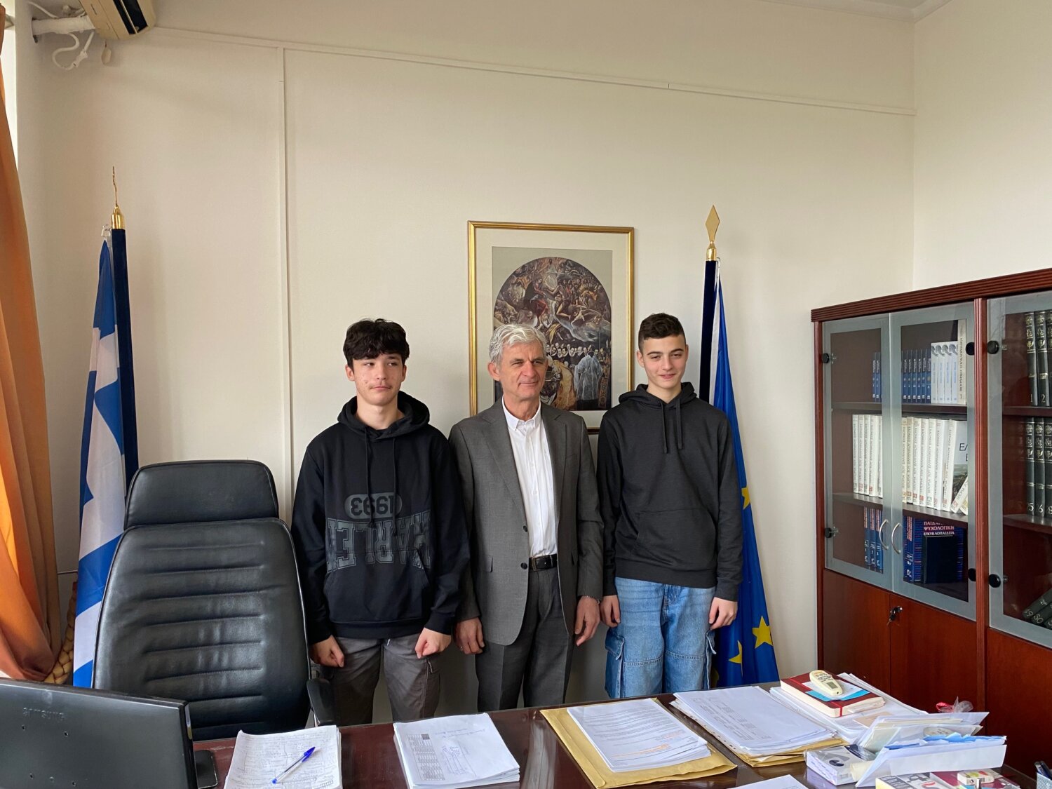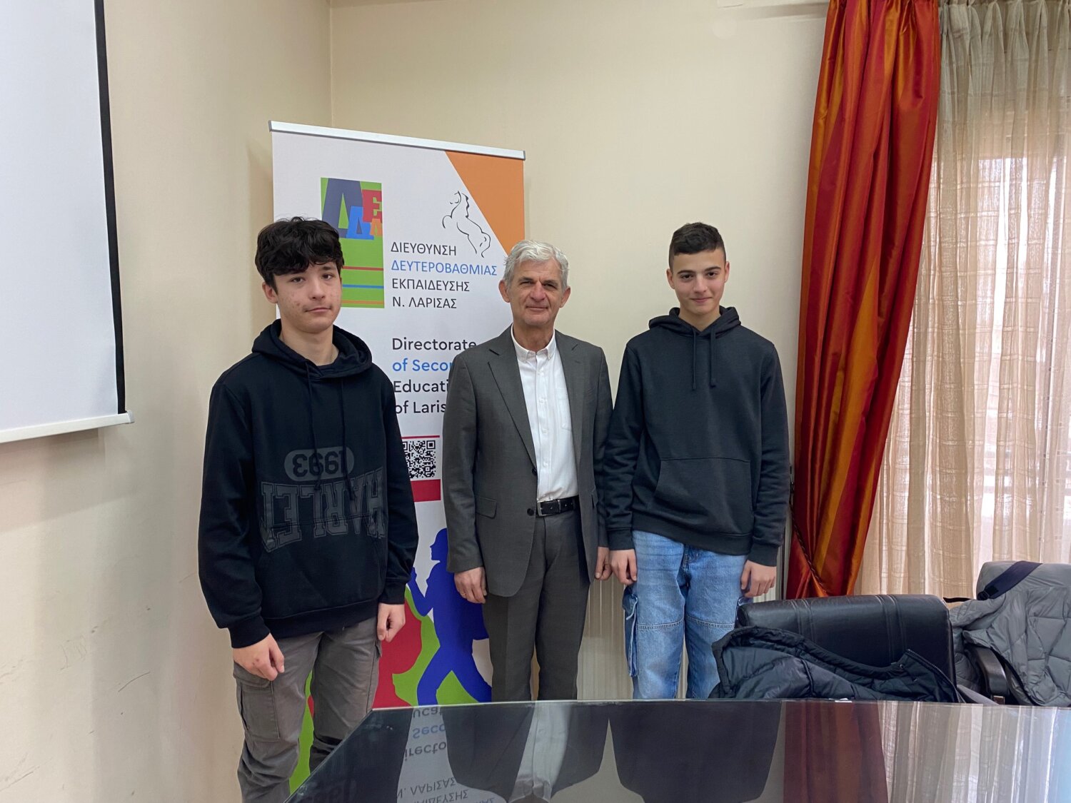 Ο Αν. Διευθυντής Δευτεροβάθμιας Εκπαίδευσης Λάρισας, κ. Νικόλαος Ζέρβας, είχε τη χαρά να δεχτεί σήμερα στο Γραφείο του, κατόπιν πρόσκλησης, τους Λαρισαίους μαθητές Άγγελο Γουματιανό, μαθητή της Α’ Λυκείου του 14ου ΓΕΛ Λάρισας και Φίλιππο Κοκκινίδη, μαθητή της Γ’ Γυμνασίου του Μουσικού Σχολείου Λάρισας, προκειμένου να τους επιβραβεύσει για τη διεθνή τους διάκριση στον Παγκόσμιο Διαγωνισμό Ρομποτικής Robotex International 2025.