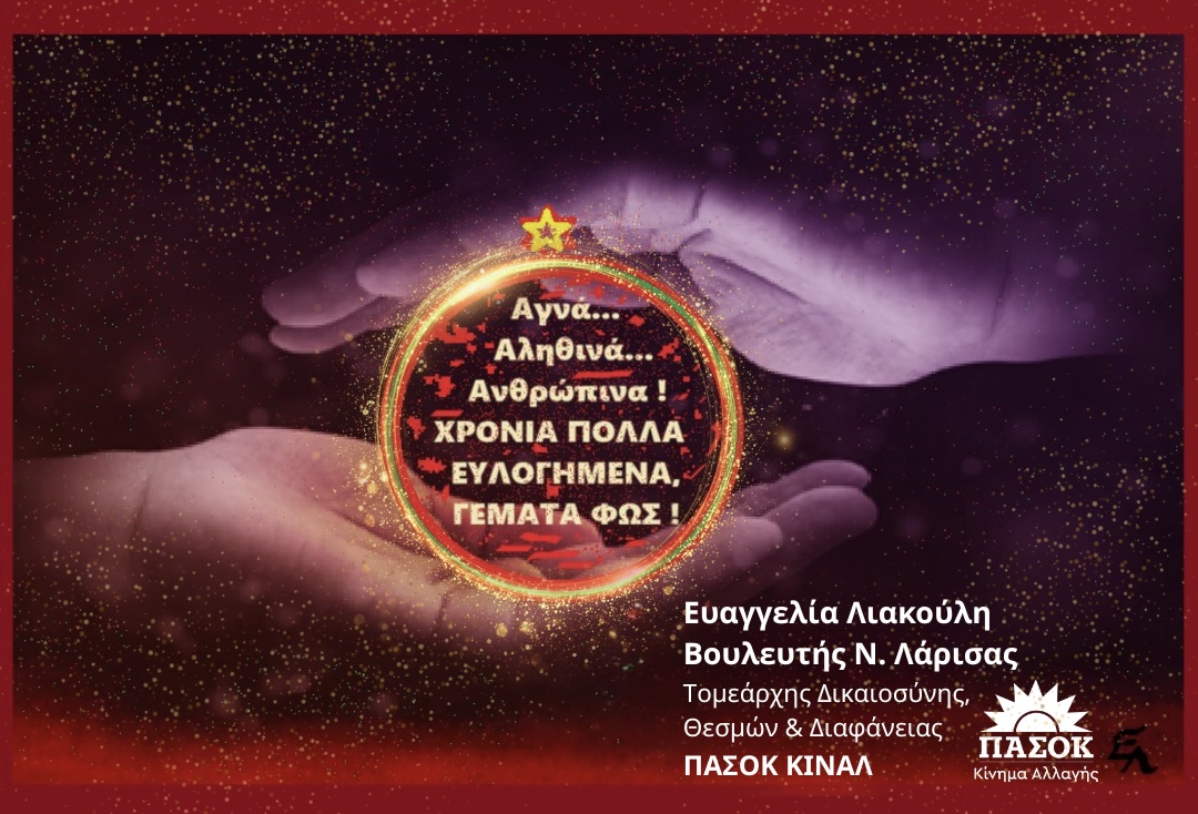 Με μήνυμά της ενόψει των Χριστουγέννων, η Βουλευτής Λάρισας και Τομεάρχης Δικαιοσύνης, Θεσμών και Διαφάνειας του ΠΑΣΟΚ – Κινήματος Αλλαγής, Ευαγγελία Λιακούλη, απευθύνει τις ευχές της σε όλες και όλους τους πολίτες, αναδεικνύοντας παράλληλα τις συνθήκες μέσα στις οποίες βιώνονται τα φετινά Χριστούγεννα, σε μια περίοδο έντονων κοινωνικών, οικονομικών και θεσμικών προκλήσεων για τη Θεσσαλία και τη χώρα.