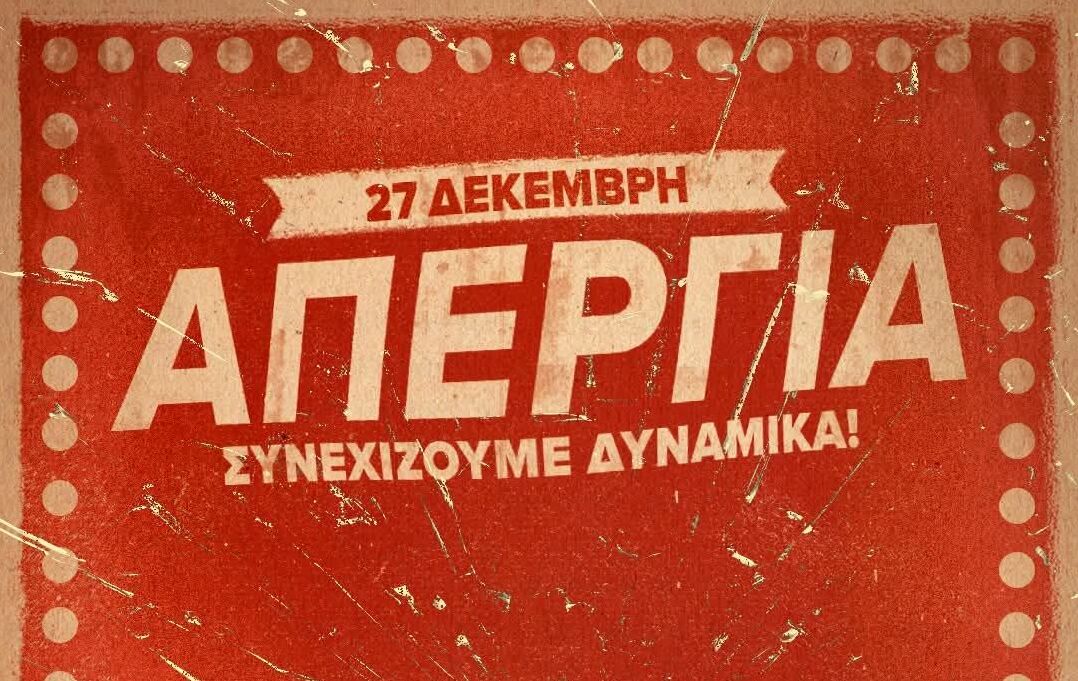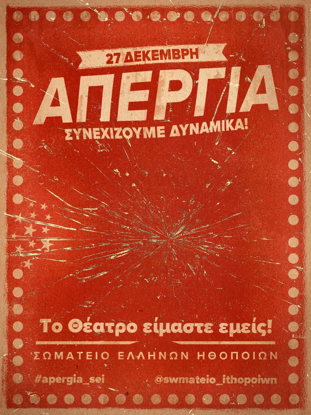 «Απεργία στα θέατρα σήμερα Σάββατο 27 Δεκεμβρίου. Το «Συνεργείο Μουσικού Θεάτρου» (ΣΜΟΥΘ) στη Λάρισα σε ανάρτησή του ενημερώνει πως η σημερινή παράσταση δεν θα πραγματοποιηθεί λόγω συμμετοχής των ηθοποιών στην Απεργία που έχει Προκηρύξει το Σωματείο Ελλήνων Ηθοποιών!