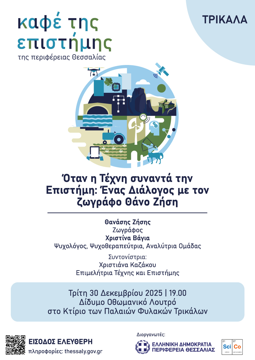 Με μια ξεχωριστή εκδήλωση που φέρνει σε δημιουργική συνομιλία την τέχνη και την επιστήμη, ρίχνει αυλαία για το 2025 το «Καφέ της Επιστήμης της Περιφέρειας Θεσσαλίας» στα Τρίκαλα, ολοκληρώνοντας τον φετινό κύκλο ανοιχτών συναντήσεων με το κοινό.