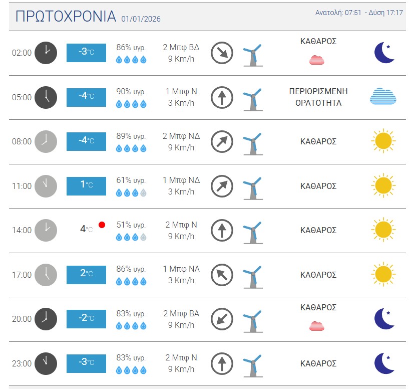 Θερμοκρασία: Από -04 (μείον τέσσερα) έως 05 με 07 βαθμούς. Στη δυτική Μακεδονία από -08 (μέιον οκτώ) έως 03 βαθμούς Κελσίου.