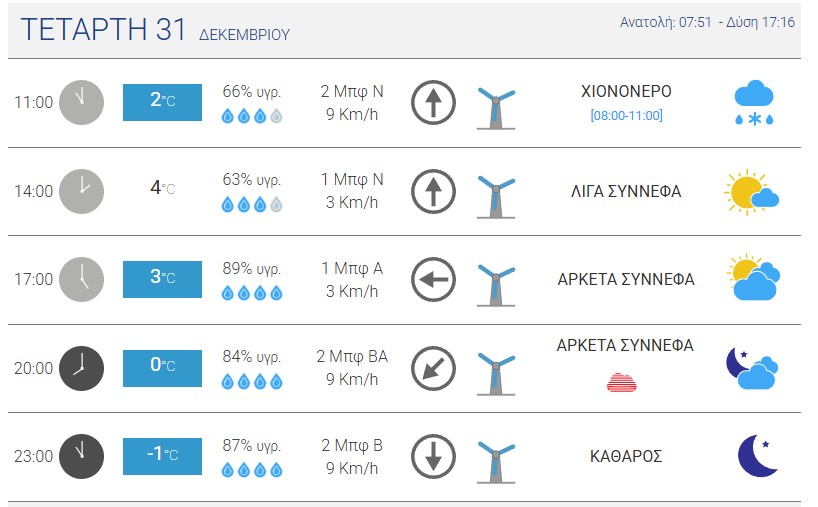 Συγκεκριμένα το δελτίο της ΕΜΥ τονίζει πως ο καιρός σήμερα Τετάρτη 31 Δεκεμβρίου θα έχει στα βόρεια λίγες νεφώσεις παροδικά αυξημένες με τοπικές βροχές ή χιονόνερο. Στην υπόλοιπη χώρα αυξημένες νεφώσεις με τοπικές βροχές, ενώ στο νότιο Αιγαίο μέχρι το μεσημέρι θα εκδηλωθούν και καταιγίδες.