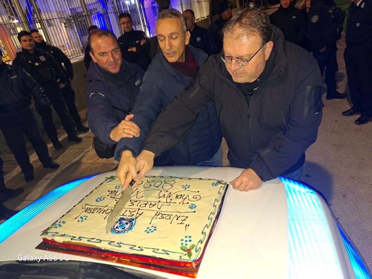 Για άλλη μια χρονιά, η Ένωση Αστυνομικών Λάρισας τήρησε το έθιμο και έκοψε την πρωτοχρονιάτικη πίτα πάνω στο περιπολικό.