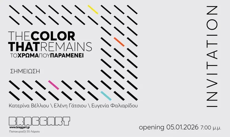 H γκαλερί σύγχρονης τέχνης BRAGGART παρουσιάζει την πρώτη έκθεση για το 2026 των εικαστικών Κατερίνας Βέλλιου, Ελένης Γάτσιου, Ευγενίας Φαλιαρίδου με τίτλο THE COLORTHAT REMAINS ΤΟ ΧΡΩΜΑ ΠΟΥ ΠΑΡΑΜΕΝΕΙ: ΣΗΜΕΙΩΣΗ από της 05 Ιανουαρίου έως τις 05 Φεβρουαρίου 2026. Τα εγκαίνια θα πραγματοποιηθούν 05 Ιανουαρίου στις 19:00.
