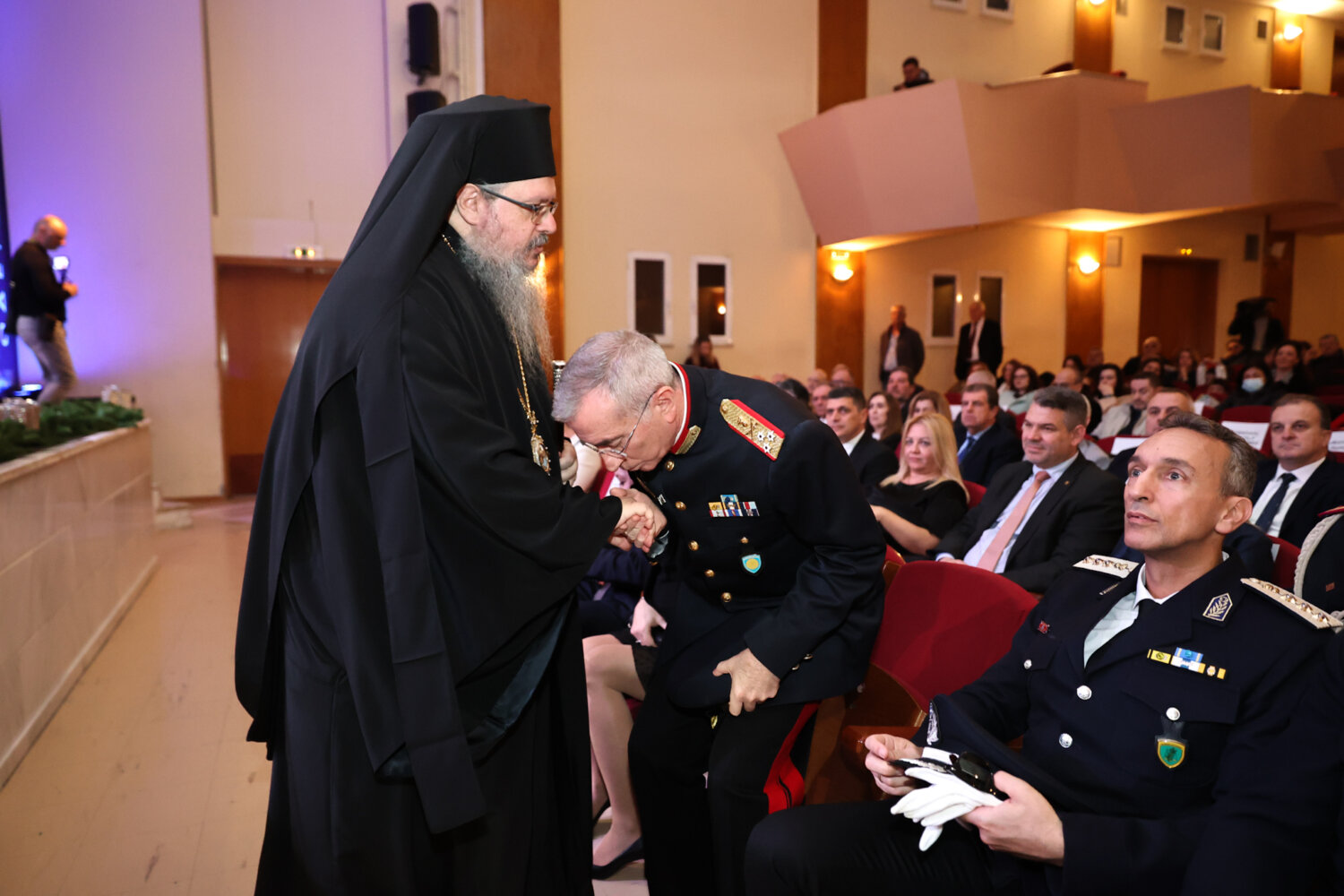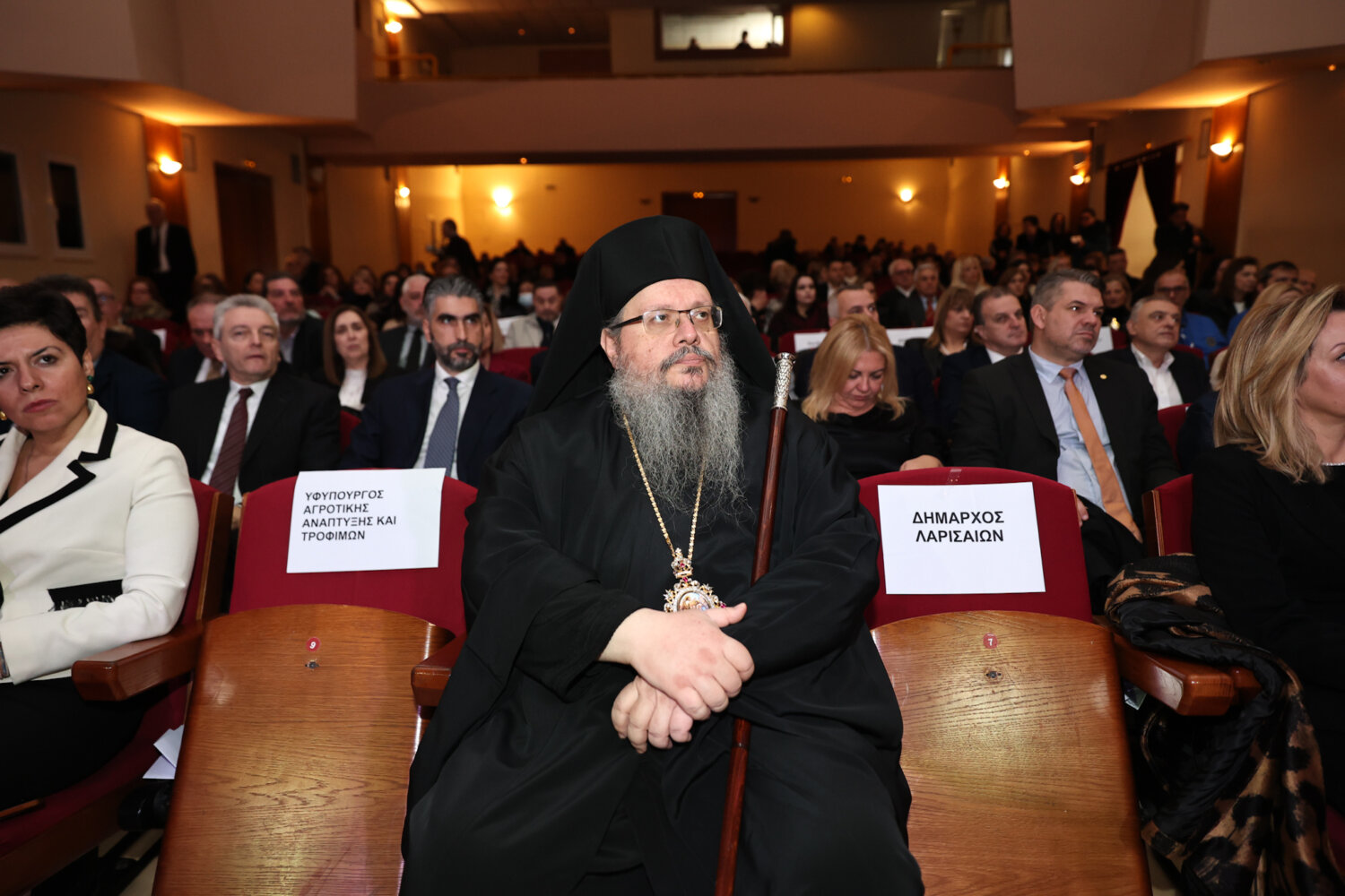 Η δεξίωση και η κοπή της πρωτοχρονιάτικης πίτας έλαβε χώρα στην αίθουσα συναυλιών του Δημοτικού Ωδείου Λάρισας, όπου την ευλόγησε ο Μητροπολίτης Λαρίσης και Τυρνάβου Ιερώνυμος, όπου μεταξύ άλλων τόνισε να «μην υποχωρήσει η έννοια της δικαιοσύνης».