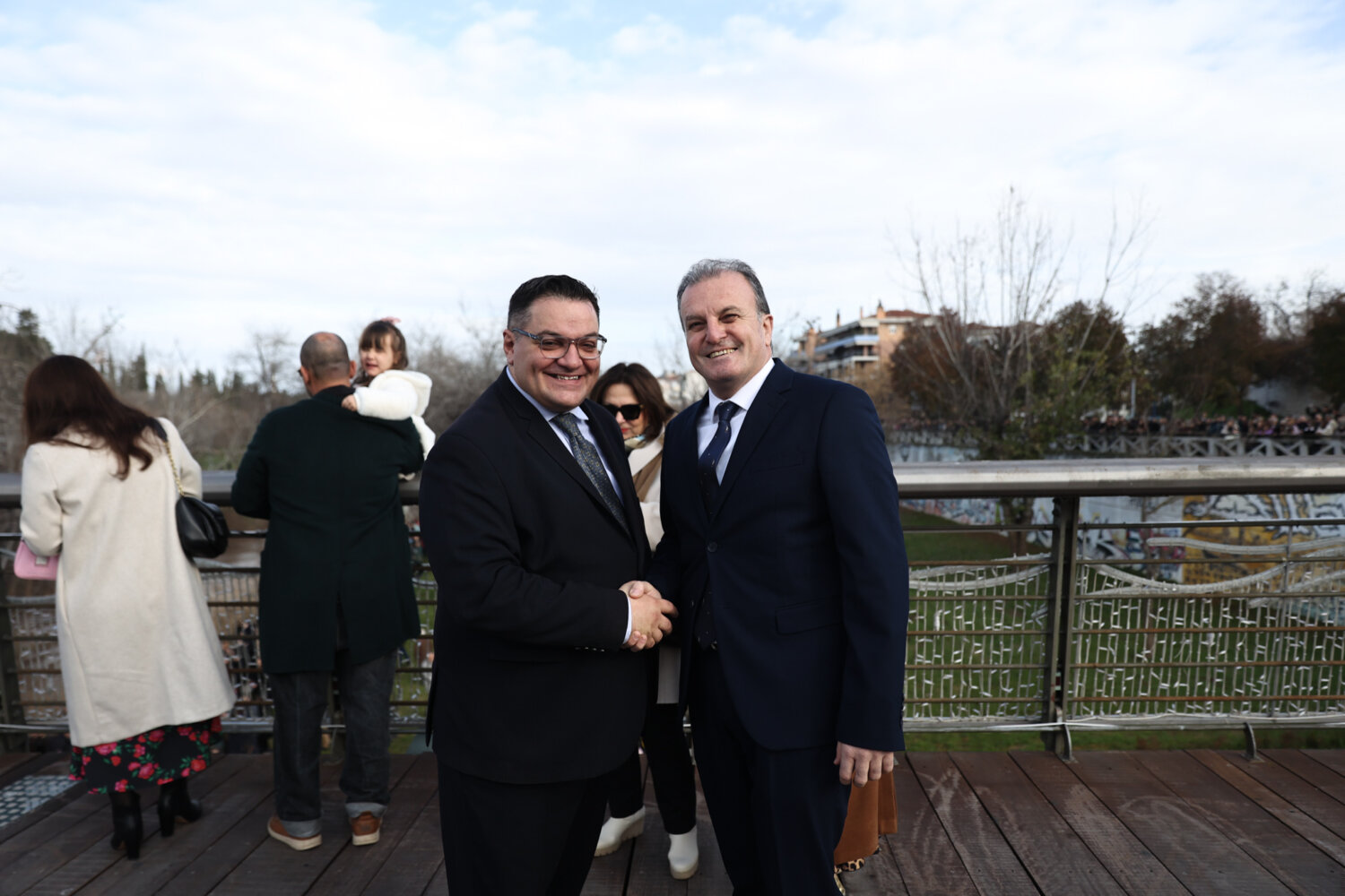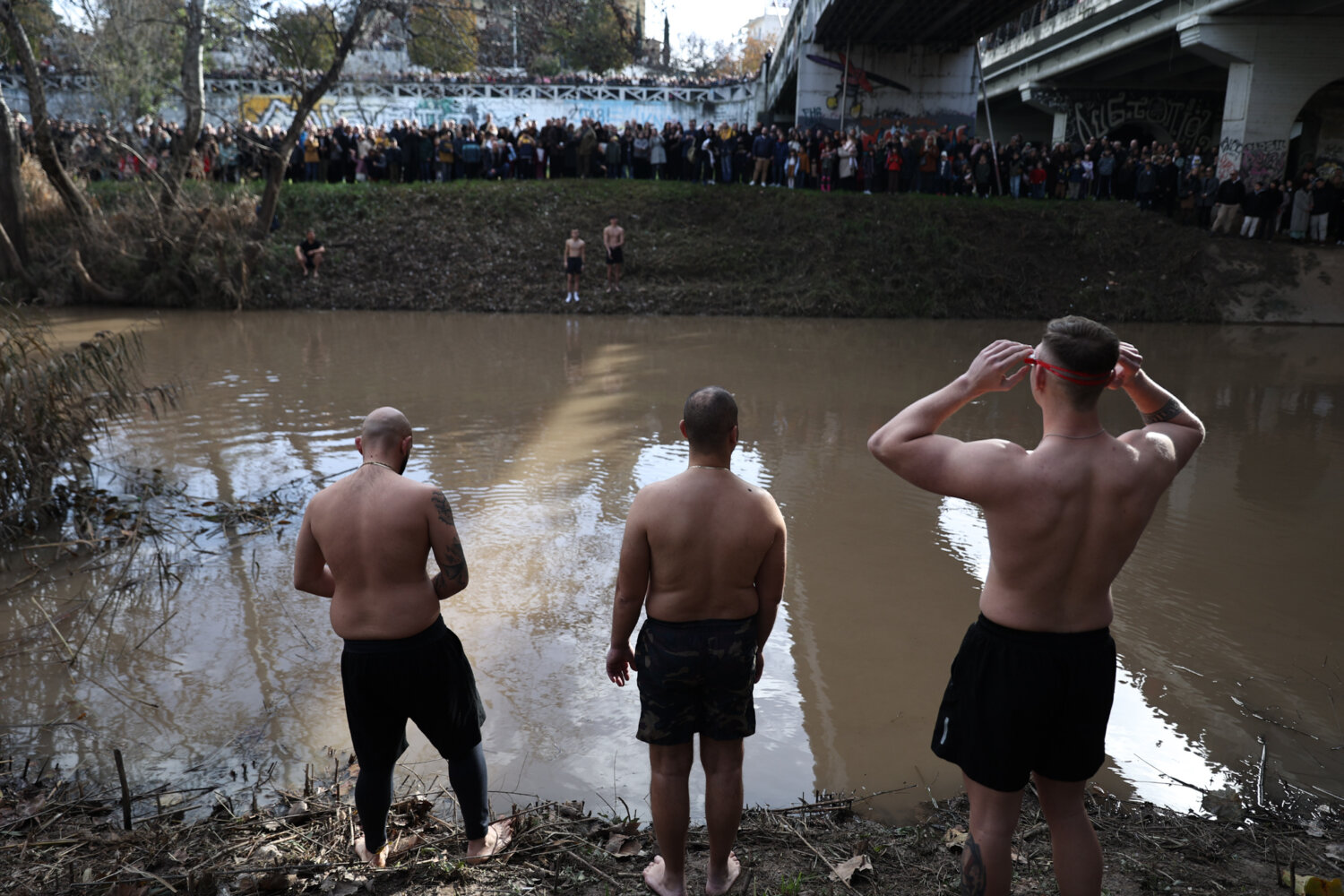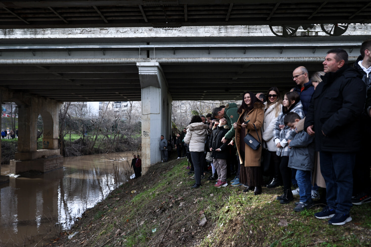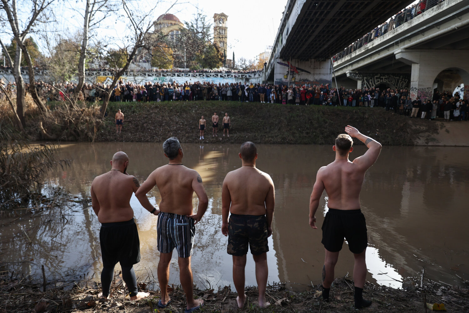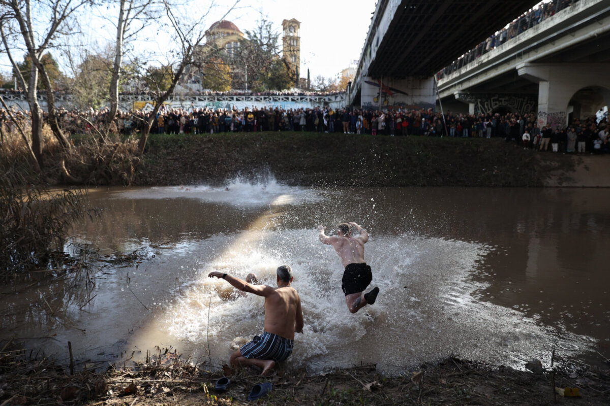 Μετά τον Μέγα Αγιασμό των Υδάτων, ο οποίος τελέστηκε από τον Μητροπολίτη Λαρίσης και Τυρνάβου Ιερώνυμο εντός τους Μητροπολιτικού Ναού του Αγίου Αχιλλίου, ακολούθησε η κατάδυση του Τιμίου Σταυρού στη Γέφυρα του Πηνειού.