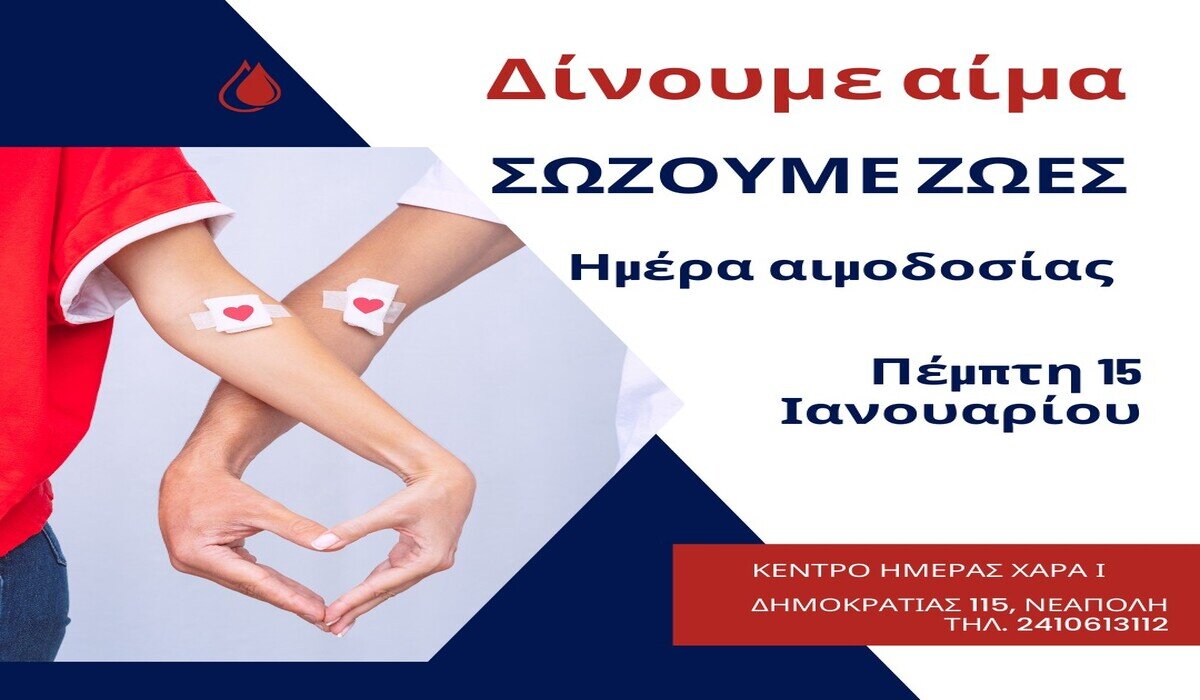 Το σωματείο εργαζομένων του Συλλόγου Αυτισμού Λάρισα σε συνεργασία με την κινητή μονάδα αιμοδοσίας του Πανεπιστημιακού Γενικού Νοσοκομείου Λάρισας διοργανώνουν δράση αιμοδοσίας, την Πέμπτη 15 Ιανουαρίου, από 9π.μ. έως 1:30μ.μ., στον ισόγειο χώρο του Κέντρου Ημέρας ΧΑΡΑ Ι, Δημοκρατίας 115, Νεάπολη, Λάρισα.