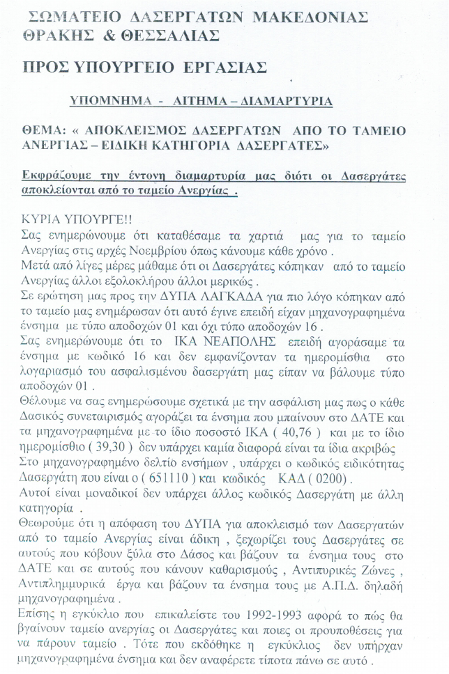 Επισημαίνεται ότι «καταθέτουμε ΑΝΑΦΟΡΑ το υπόμνημα του Σωματείου Δασεργατών Μακεδονίας Θράκης και Θεσσαλίας, στο οποίο ζητούν να δοθεί άμεσα λύση στον αποκλεισμό Δασεργατών από το Ταμείο Ανεργίας για να πάρουν οι Δασεργάτες αυτά που δικαιούνται».