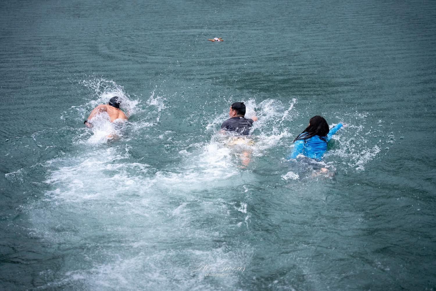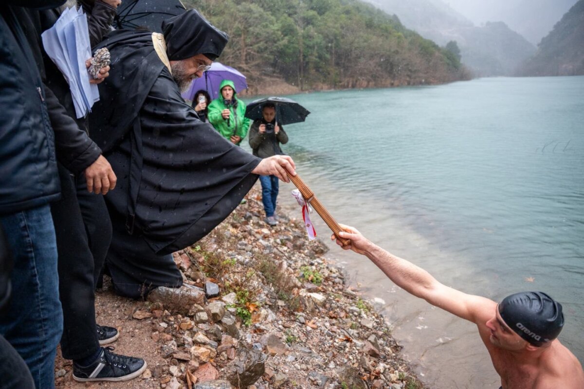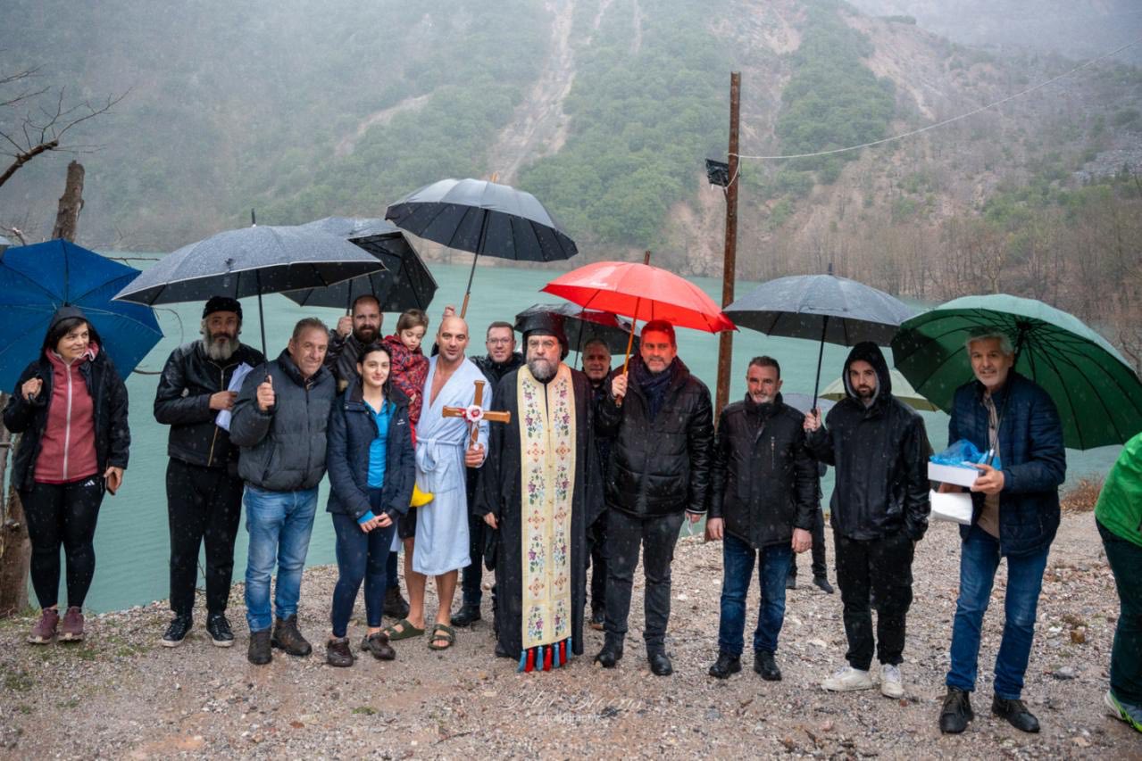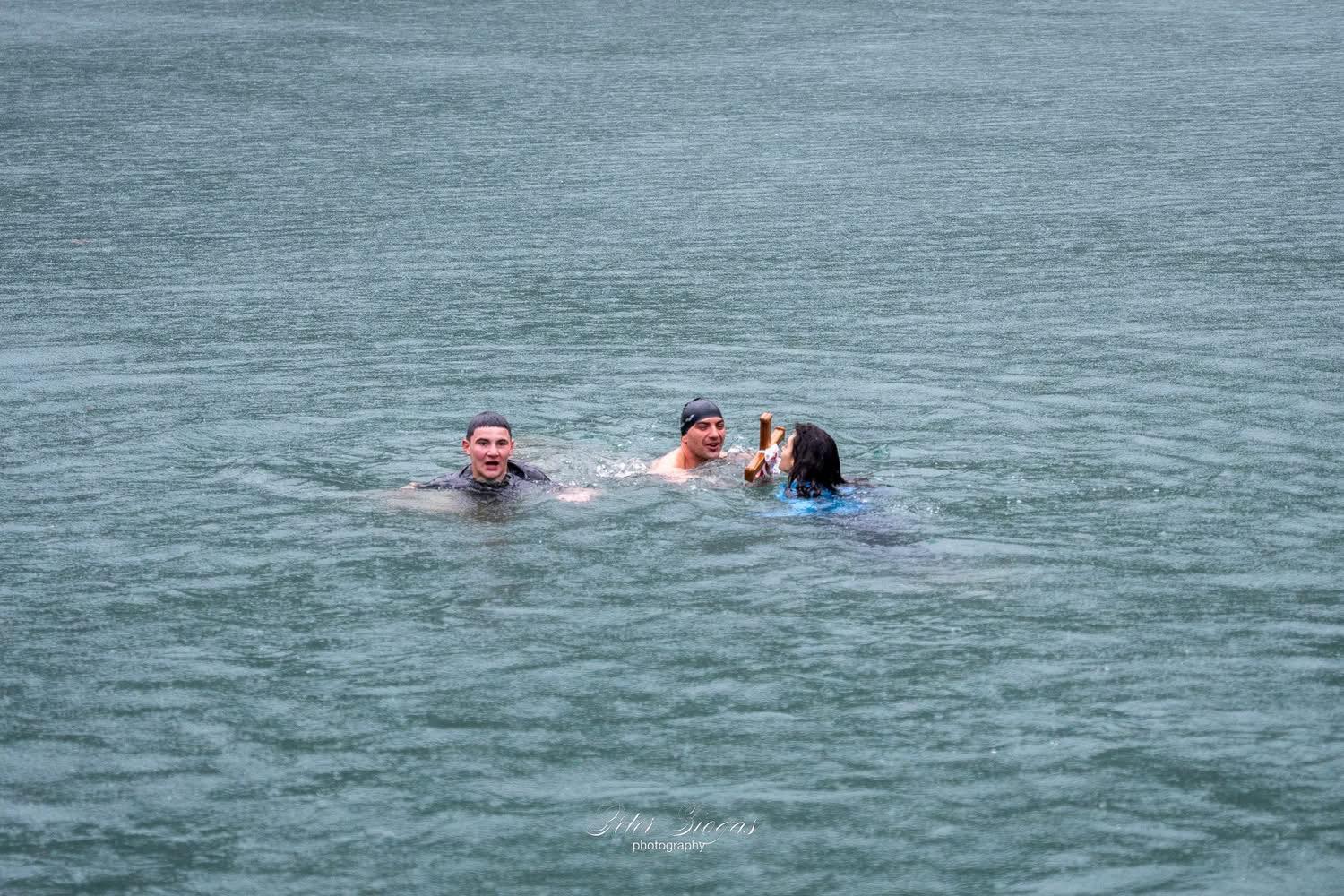 Στην συνέχεια κατευθύνθηκαν όλοι παρά τις δύσκολες καιρικές συνθήκες στην παρακείμενη λίμνη της Στεφανιάδας όπου και τελέστηκε η κατάδυση του Τιμίου Σταυρού και ο αγιασμός των υδάτων.