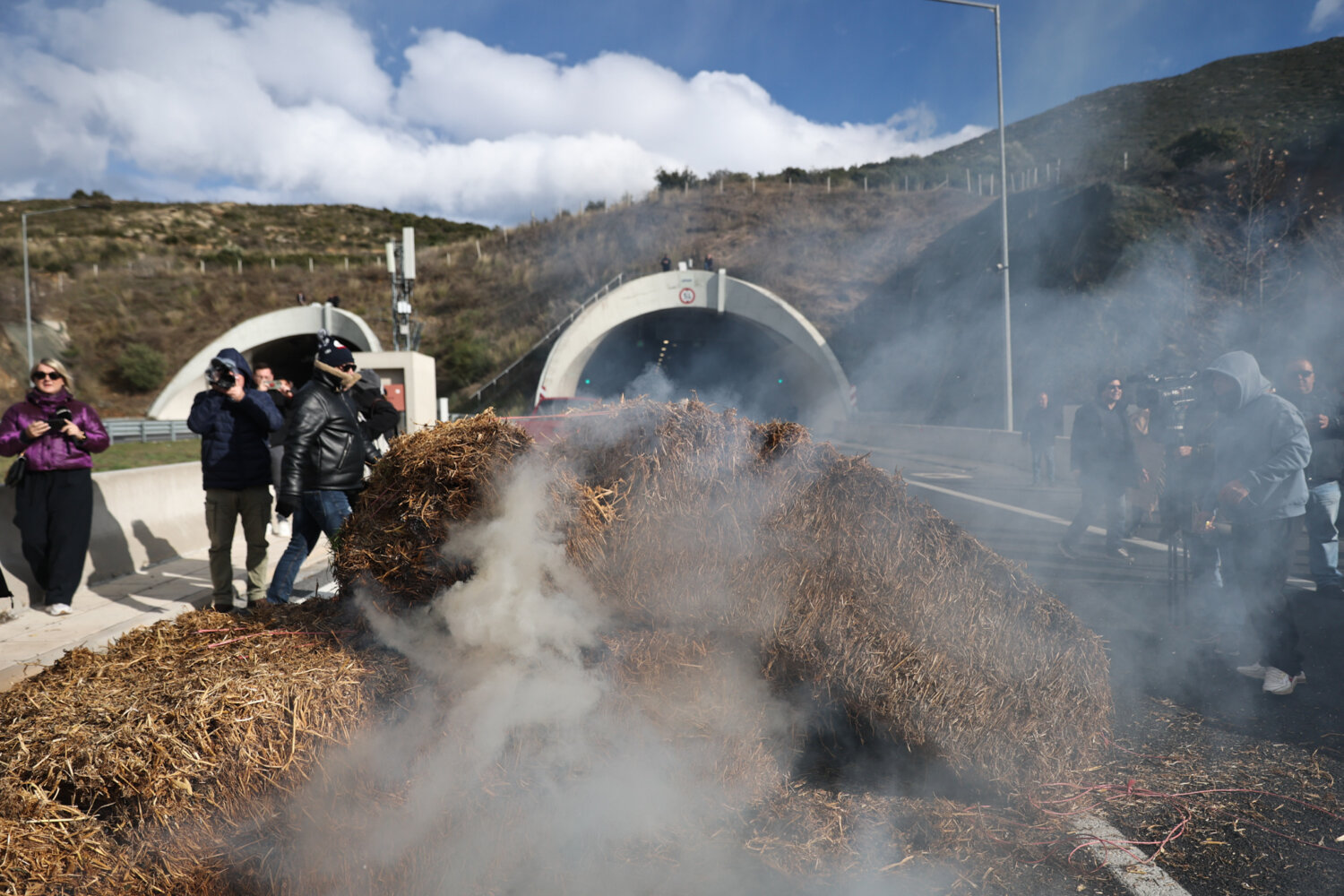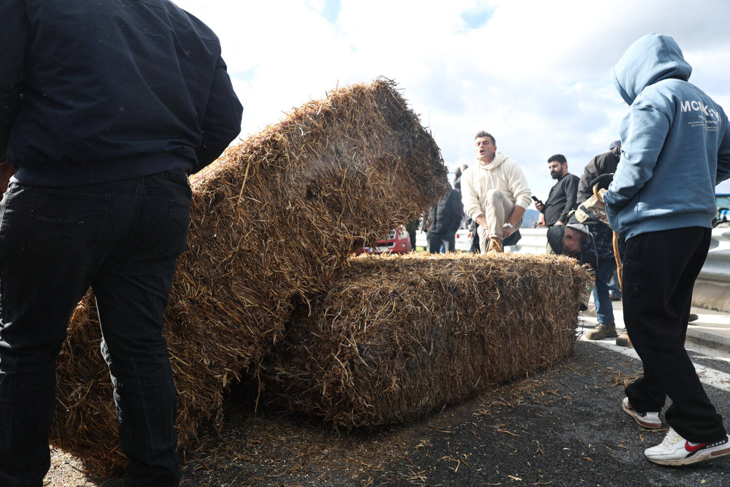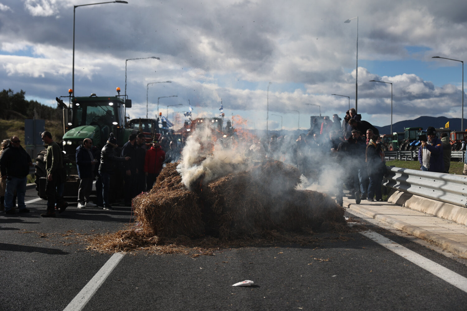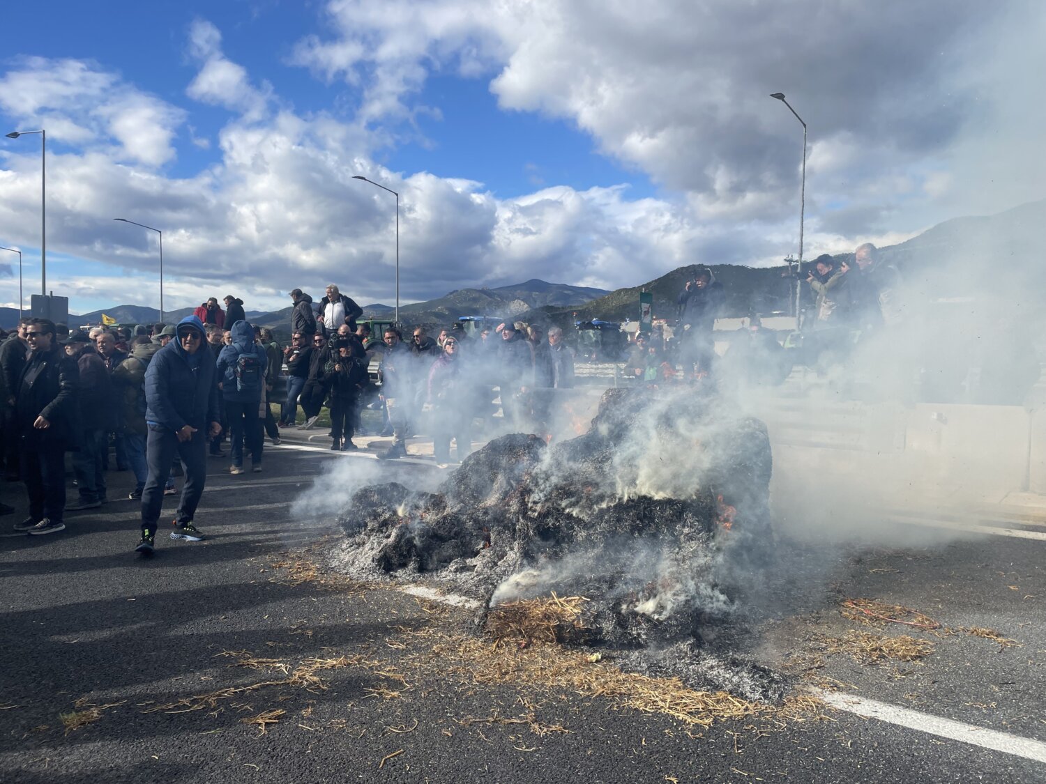 Περίπου 140 τρακτέρ έφτασαν στο σημείο με κόρνες, ενώ αγρότες και κτηνοτρόφοι του μπλόκου της Νίκαιας έκαψαν μπάλες με άχυρο.