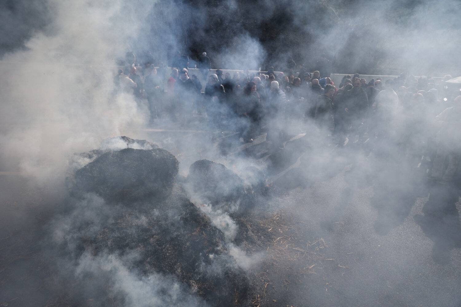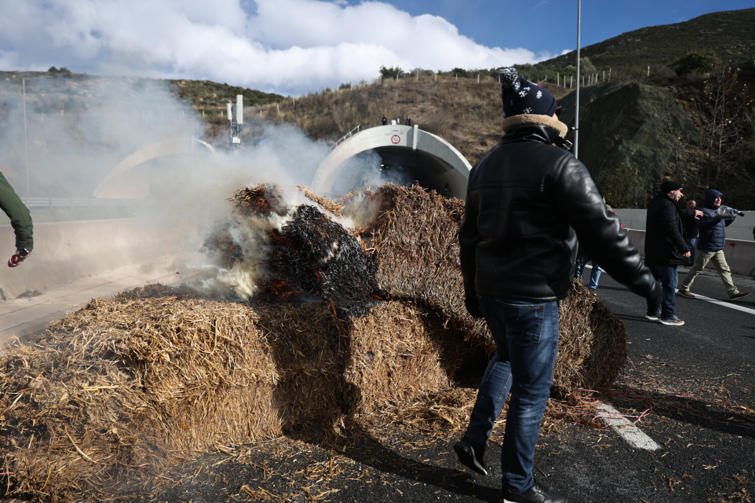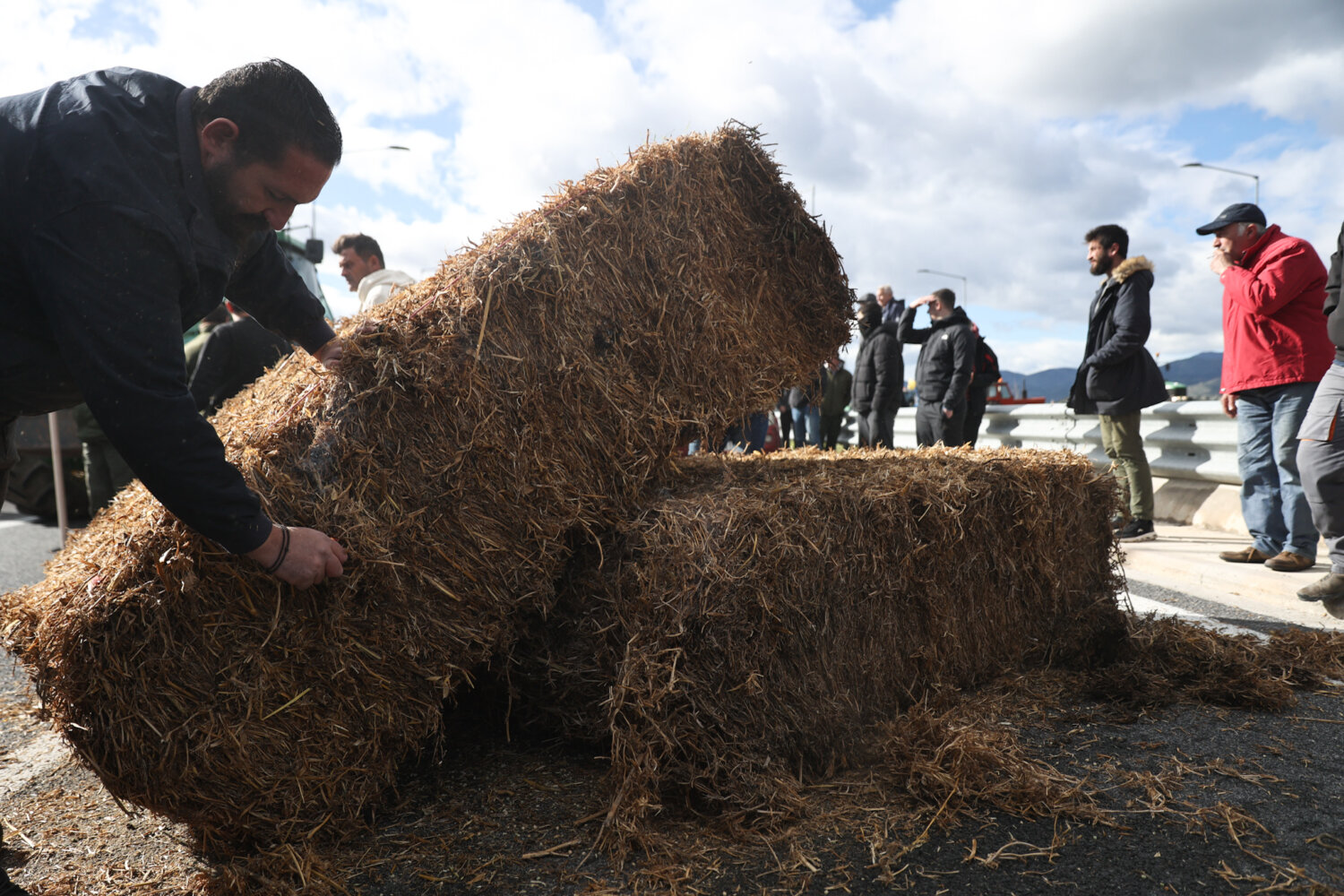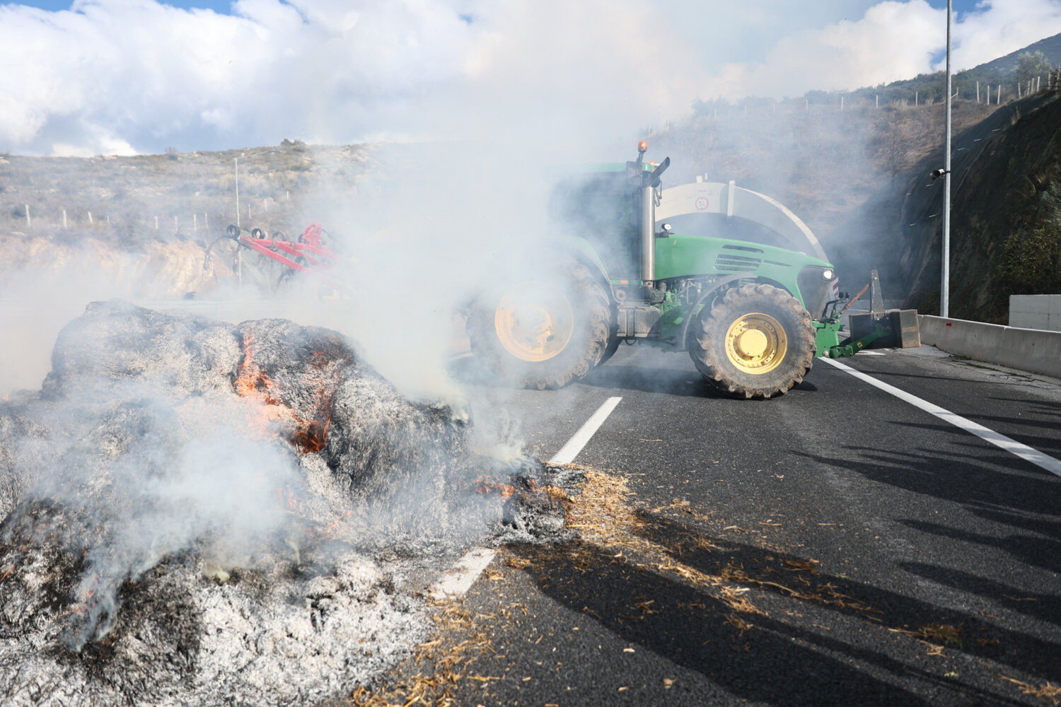 Περίπου 140 τρακτέρ έφτασαν στο σημείο με κόρνες, ενώ αγρότες και κτηνοτρόφοι του μπλόκου της Νίκαιας έκαψαν μπάλες με άχυρο.
