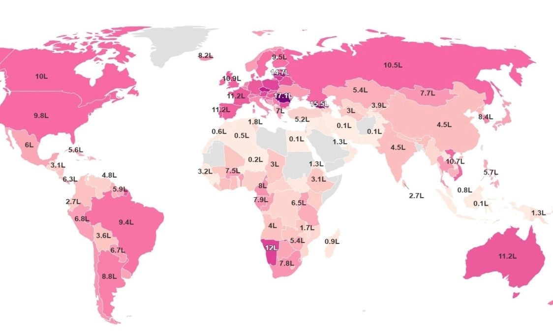 Ο παγκόσμιος χάρτης κατανάλωσης αλκοόλ δεν αναφέρεται απλώς στο ποιος πίνει πολύ και ποιος λίγο. Ουσιαστικά, καταγράφει -με έμμεσο τρόπο- ιστορίες για κοινωνίες, παραδόσεις, θρησκείες και τις καθημερινές τους συνήθειες
