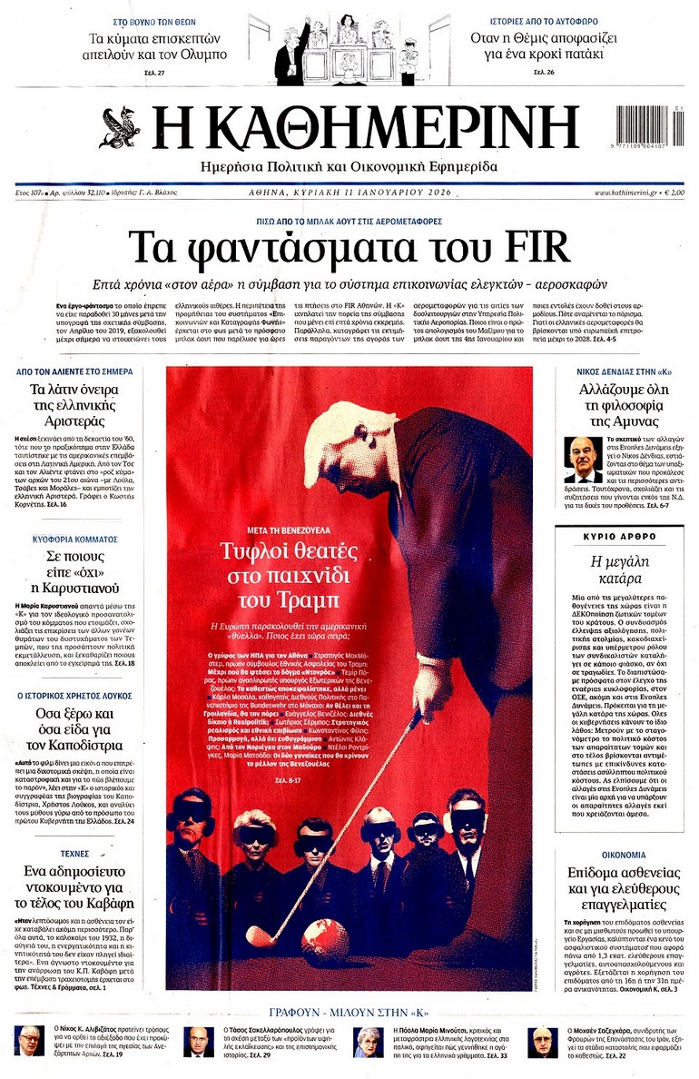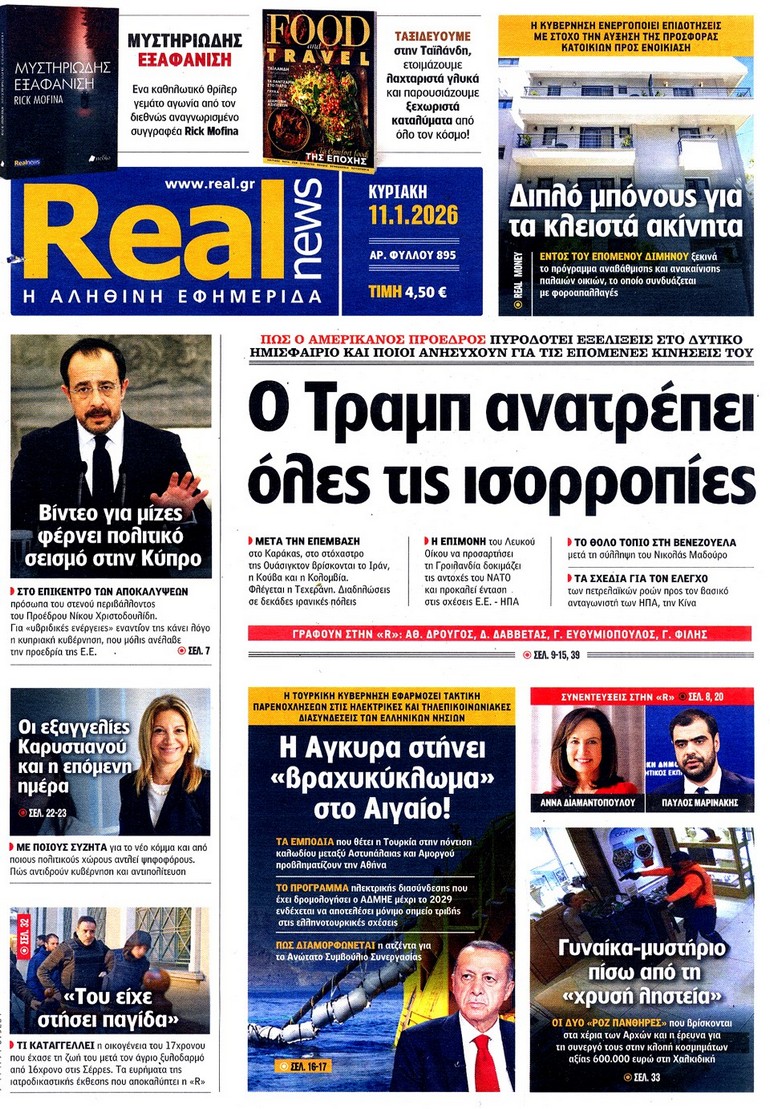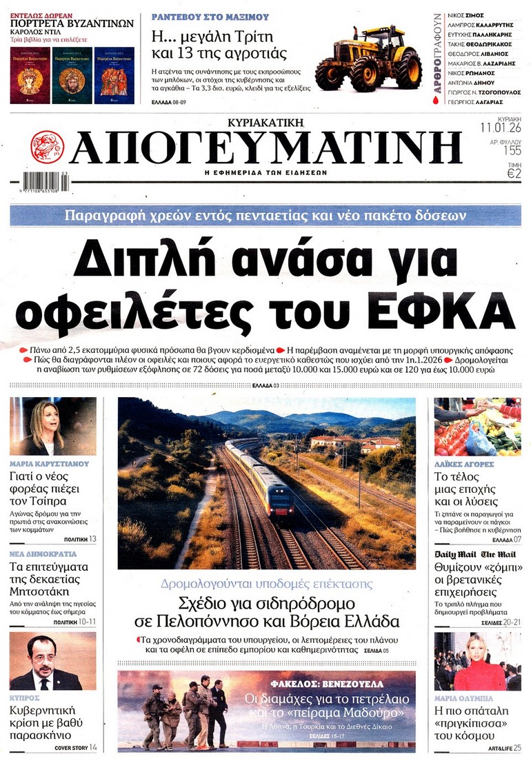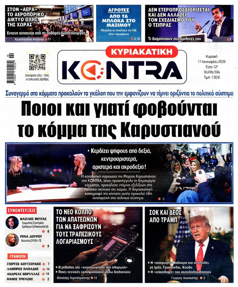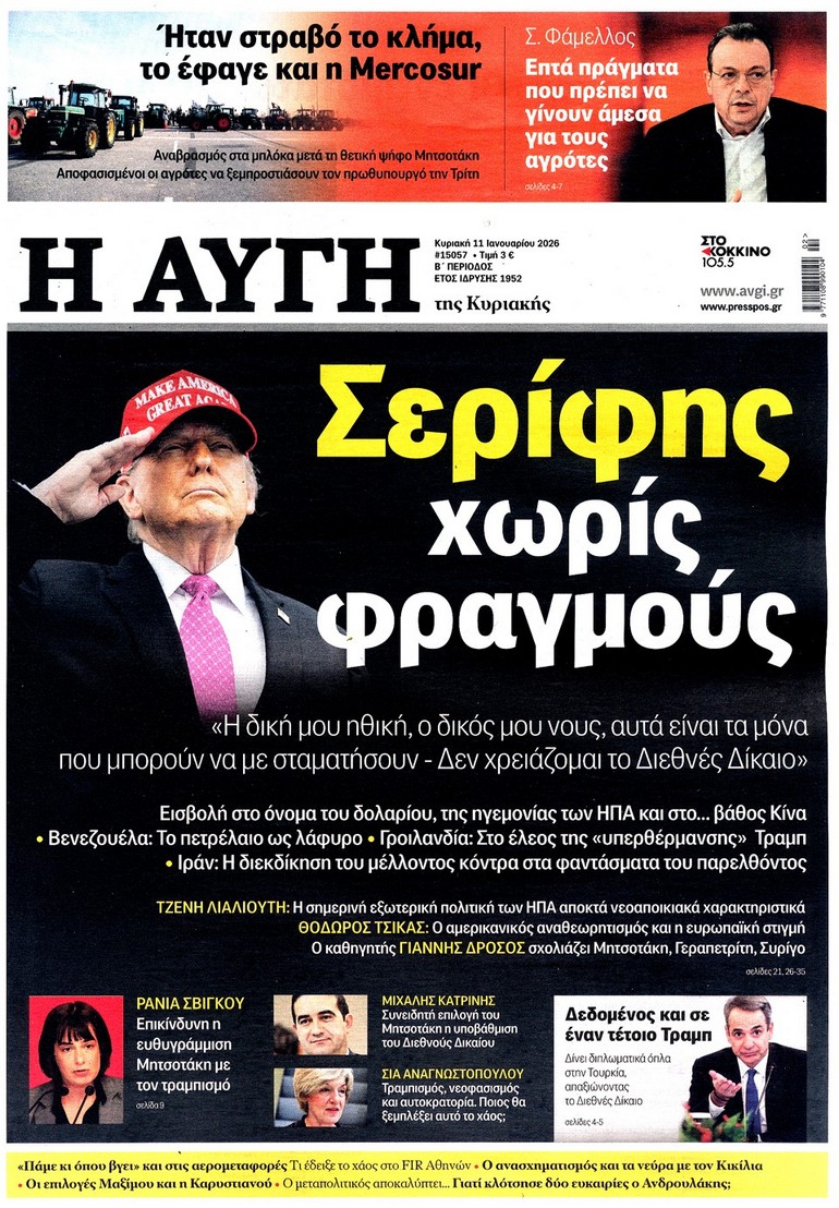 Όσα έκανε ο Ντόναλντ Τραμπ την εβδομάδα που πέρασε και η ανατροπή των ισορροπιών, η ίδρυση κόμματος από την Mαρία Καρυστιανού που αλλάζει το σκηνικό στην αντιπολίτευση, οι κινητοποιήσεις των αγροτών, αλλά και η νέα φιλοσοφία της άμυνας της χώρας ξεχωρίζουν στα πρωτοσέλιδα των κυριακάτικων εφημερίδων.