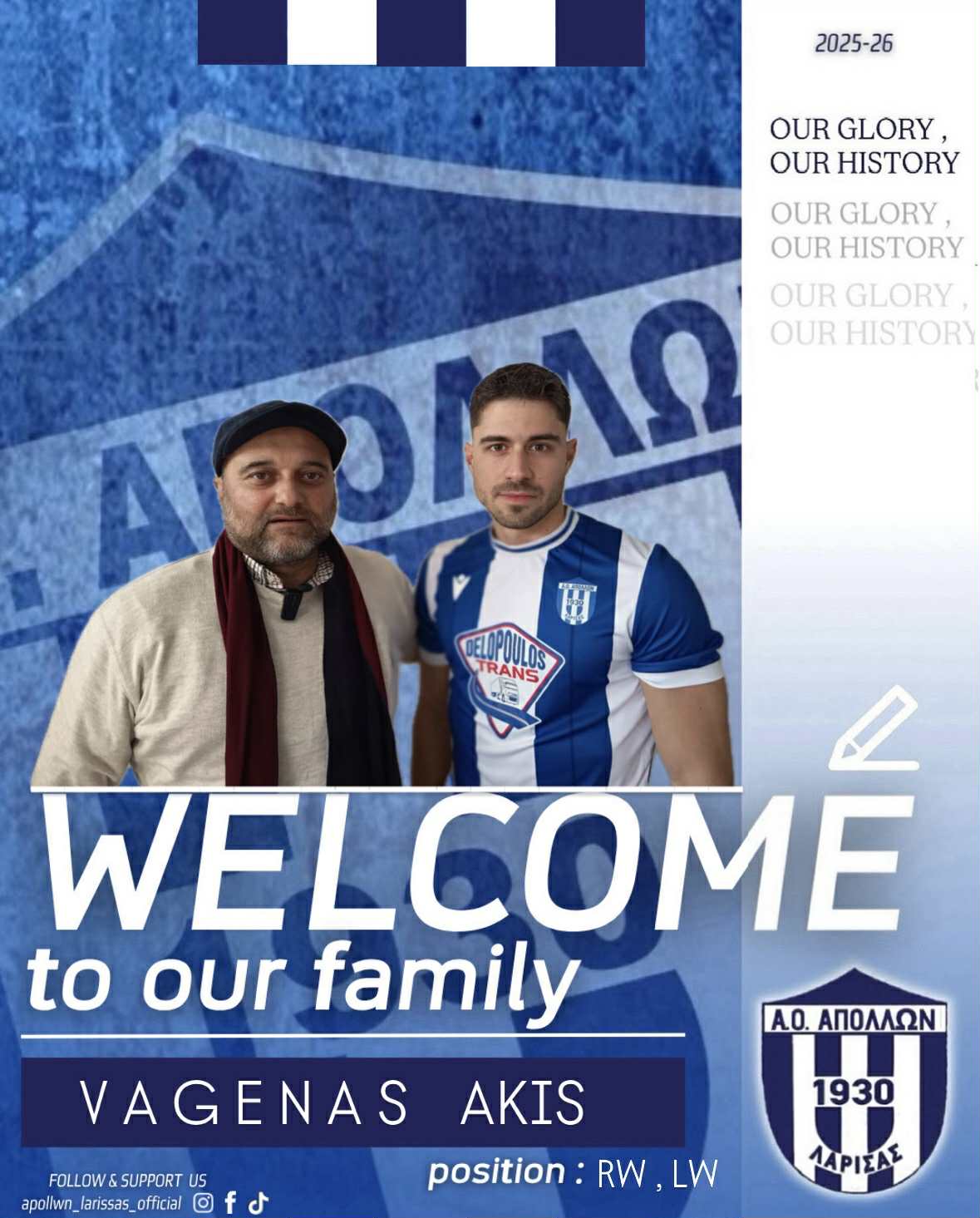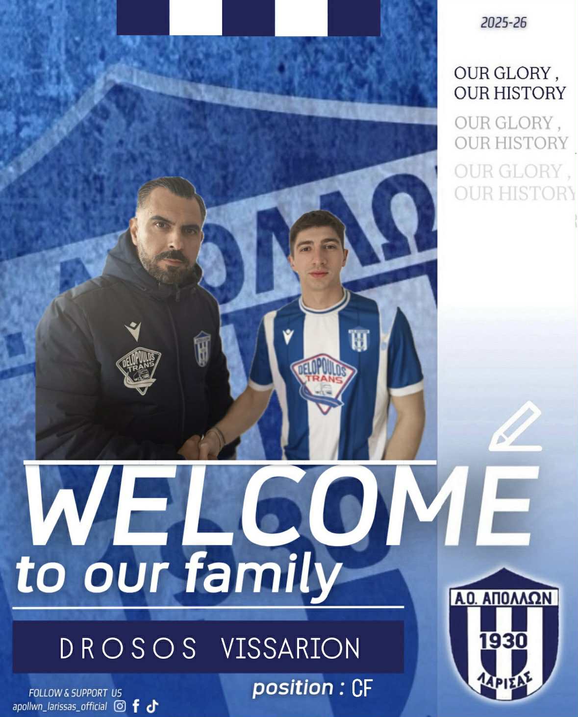 Σύσσωμος ο Απόλλων Λάρισας τον καλωσορίζει στην οικογένεια του συλλόγου και του εύχεται υγεία και πολλές επιτυχίες με τη φανέλα της ομάδας μας.