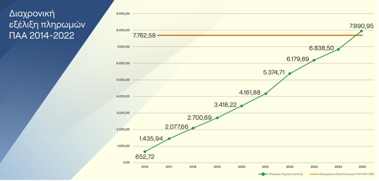 Το σύνολο των πληρωμών και από τα δύο προγράμματα, ΠΑΑ και ΣΣ ΚΑΠ, ανήλθαν εντός του 2025 σε 1.447,64 εκ. €, το οποίο είναι και το μεγαλύτερο ποσό που έχει πληρωθεί σε δράσεις του Πυλώνα ΙΙ της ΚΑΠ εντός του ίδιου έτους εφαρμογής της.