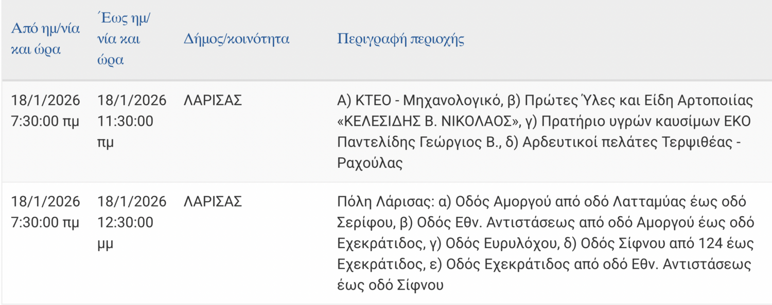 Σε προγραμματισμένες διακοπές στην παροχή ηλεκτρικού ρεύματος σε δρόμους της Λάρισας και περιοχές της Περιφερειακής Ενότητας θα προχωρήσει την Κυριακή 18 Ιανουαρίου 2026 ο ΔΕΔΔΗΕ Α.Ε.
