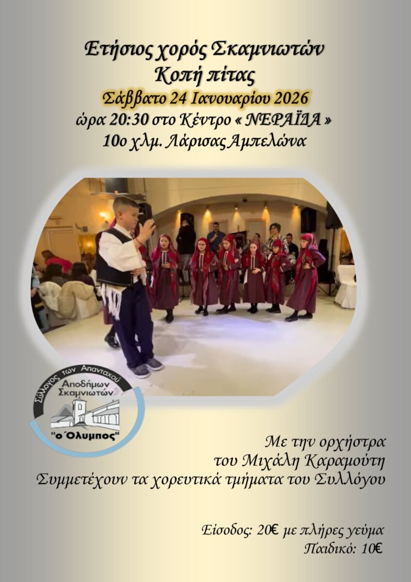 Ο Σύλλογος Απανταχού Αποδήμων Σκαμνιωτών «Ο ΟΛΥΜΠΟΣ» διοργανώνει τον καθιερωμένο ετήσιο χορό για το έτος 2026, το Σάββατο 24 Ιανουαρίου 2026 και ώρα 20:30, στο Κέντρο «ΝΕΡΑΪΔΑ», στην περιοχή του Αμπελώνα (10ο χλμ. Λάρισας – Αμπελώνα).