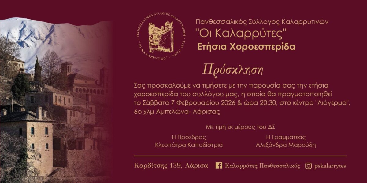 Την ετήσια χοροεσπερίδα και την κοπή της πίτας του διοργανώνει ο Πανθεσσαλικός Σύλλογος Καλαρρυτινών «Οι Καλαρρύτες».