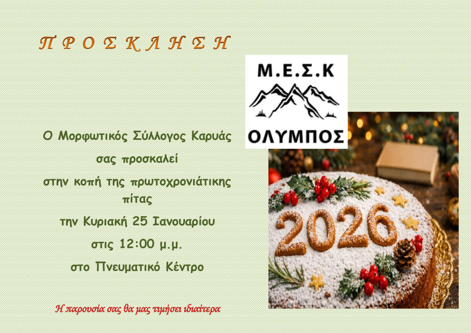 Ο Μορφωτικός Σύλλογος Καρυάς διοργανώνει κοπή της πρωτοχρονιάτικης πίτας την Κυριακή 25 Ιανουαρίου 2026 και ώρα 12.00 μ. στο Πνευματικό Κέντρο.