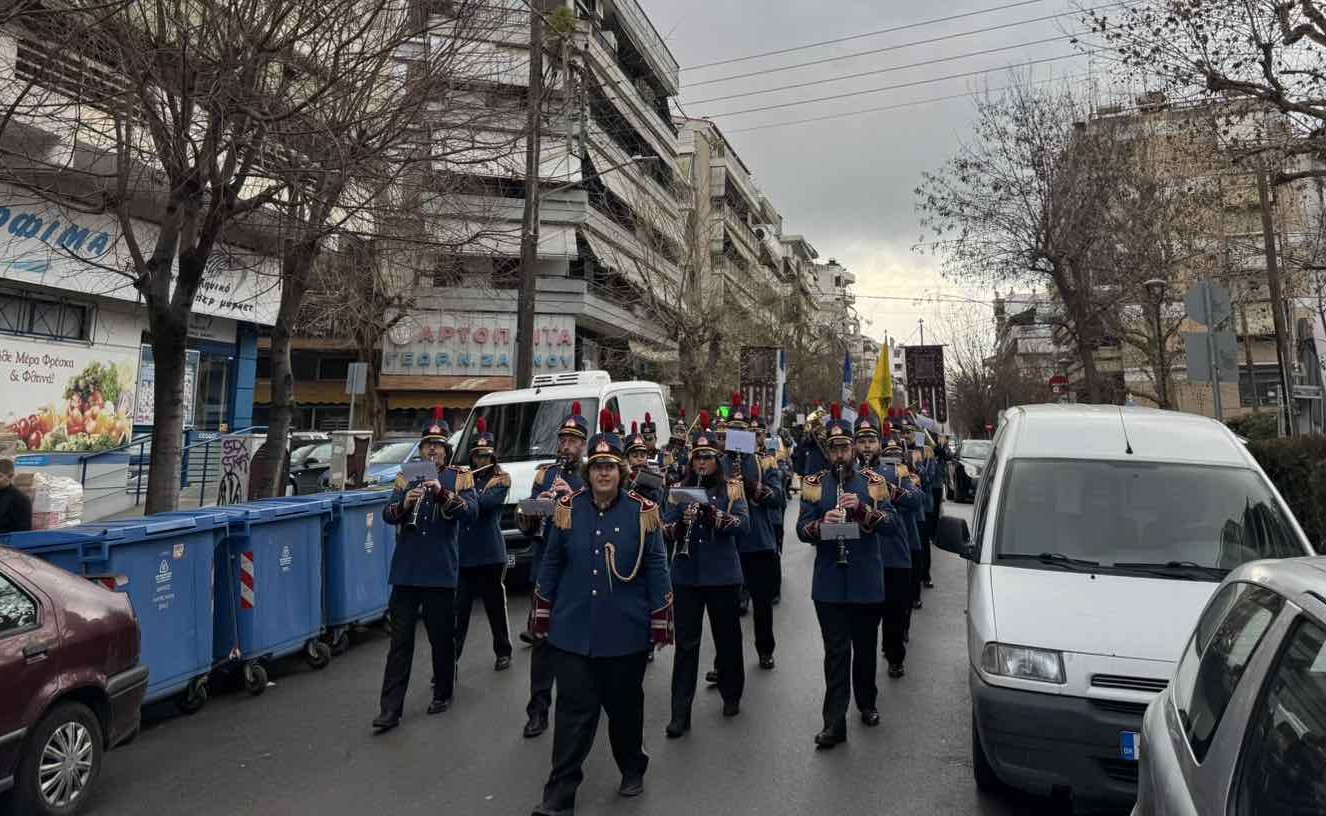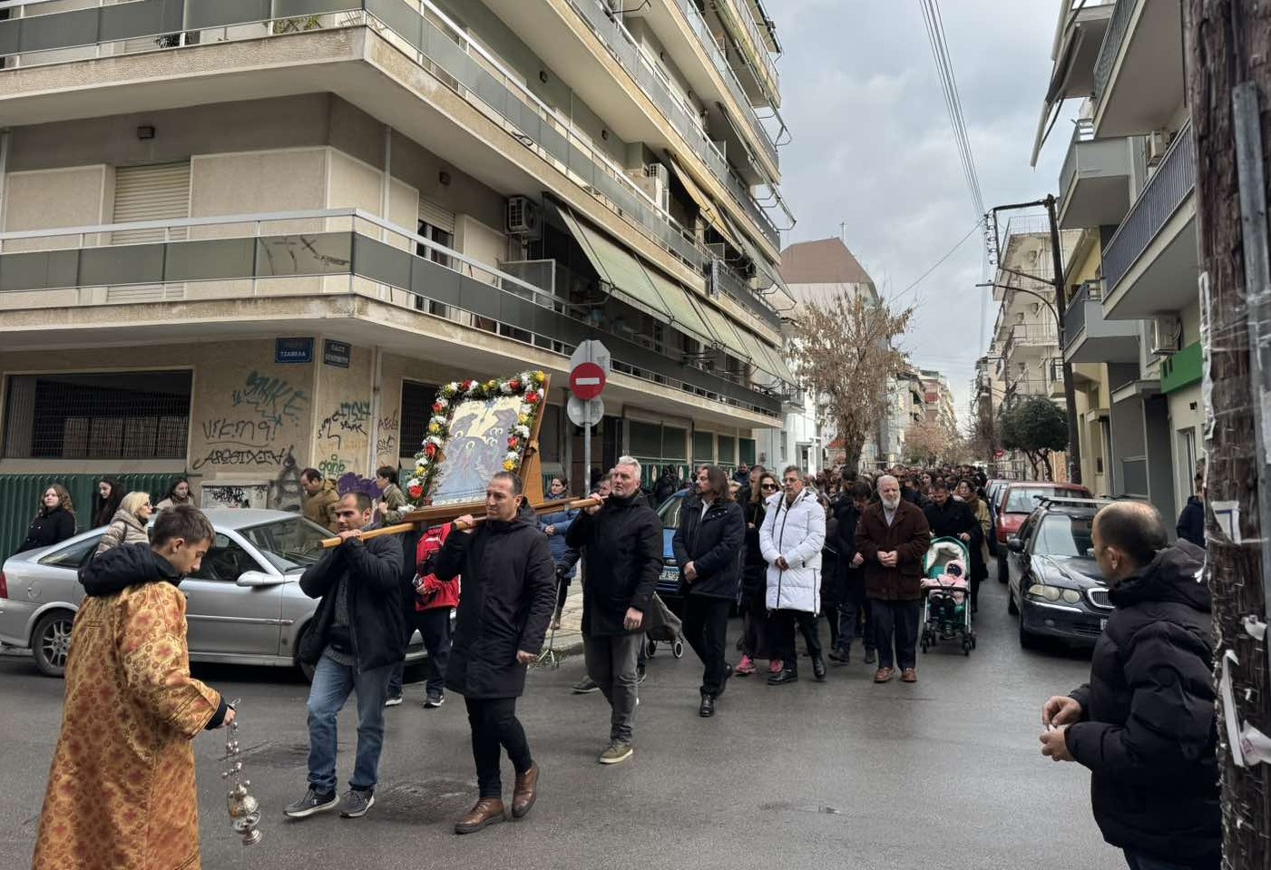 Κατόπιν, σχηματίσθηκε λιτανευτική πομπή με την Εικόνα των αγίων Θεοφανείων, τον Κλήρο και τον λαό. Συμμετείχε η Φιλαρμονική του Δήμου Λαρισαίων. Επίσης, πολλά παιδιά και νέοι με εξαπτέρυγα και ιεροπρεπή ενδυμασία.