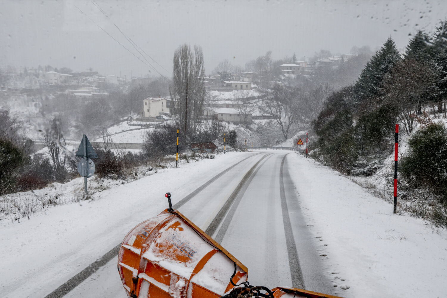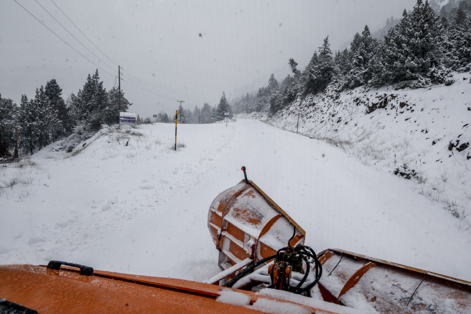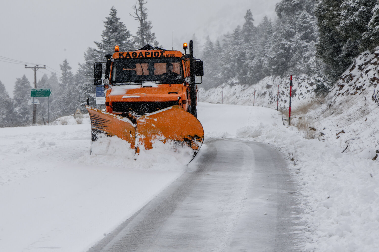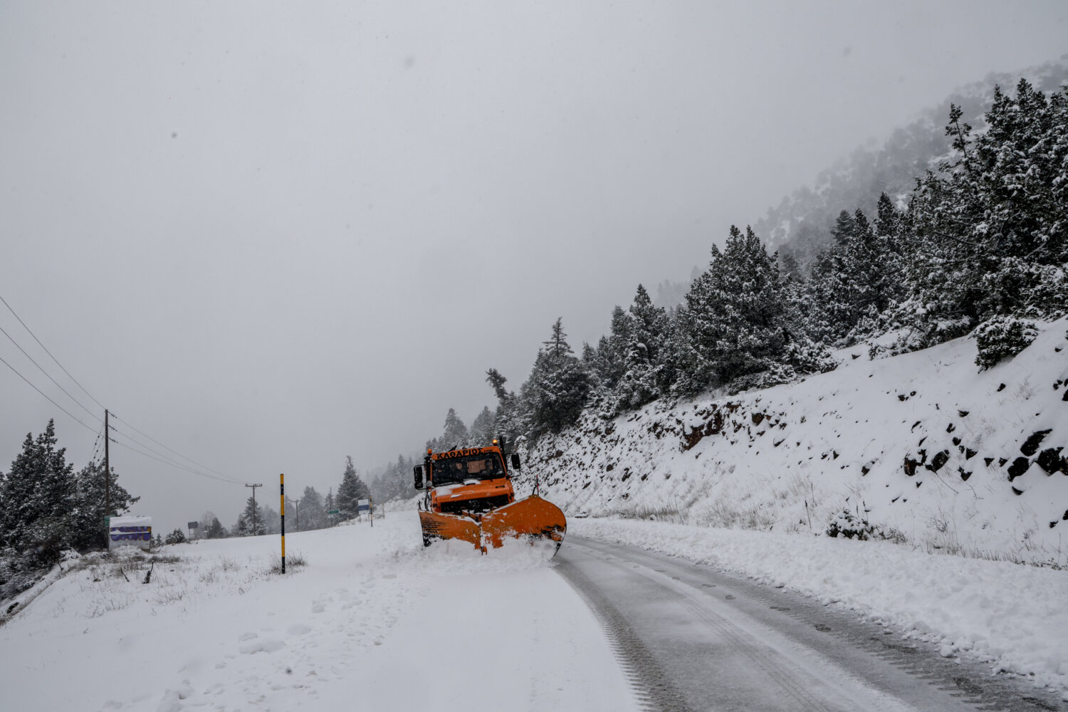 Η χιονόπτωση δημιούργησε εντυπωσιακά «ντεκόρ» στον ορεινό όγκο, τη στιγμή που τα εκχιονιστικά μηχανήματα δίνουν τη δική τους «μάχη» για να κρατήσουν ανοικτούς τους δρόμους.