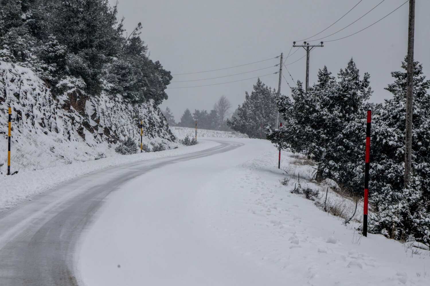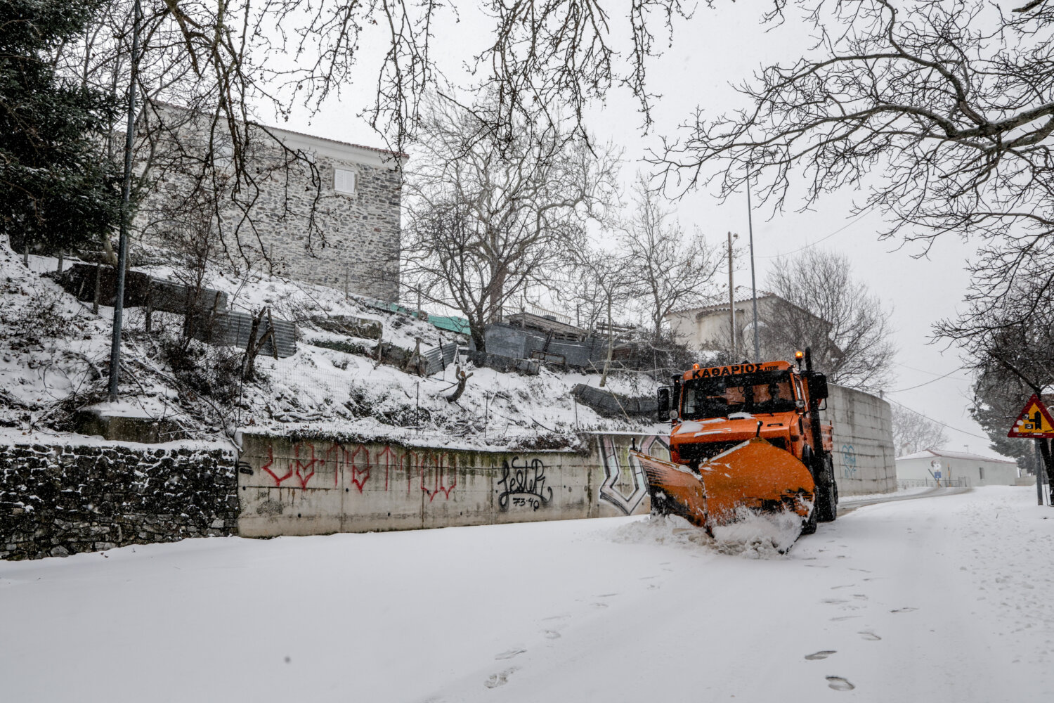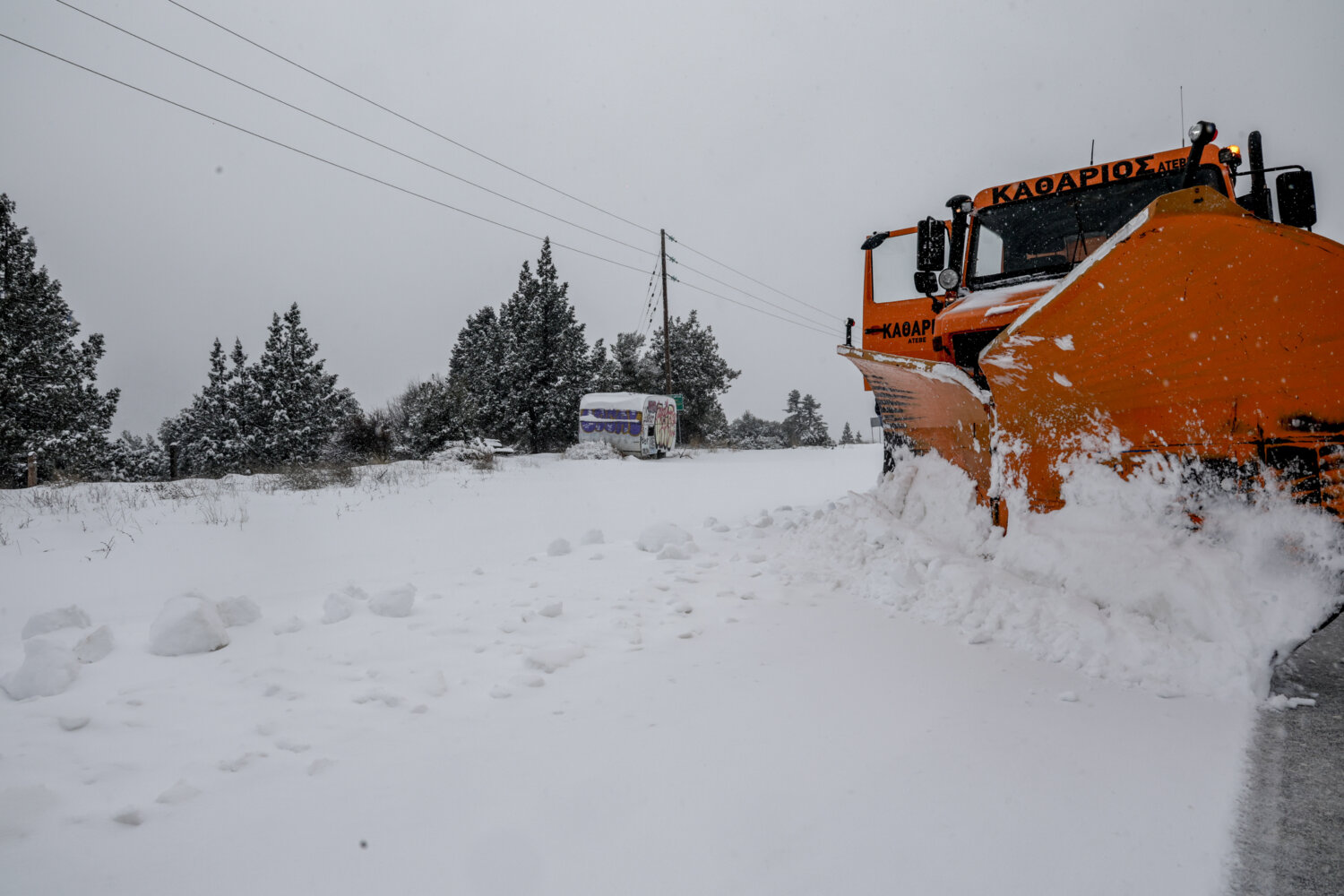 Η χιονόπτωση δημιούργησε εντυπωσιακά «ντεκόρ» στον ορεινό όγκο, τη στιγμή που τα εκχιονιστικά μηχανήματα δίνουν τη δική τους «μάχη» για να κρατήσουν ανοικτούς τους δρόμους.