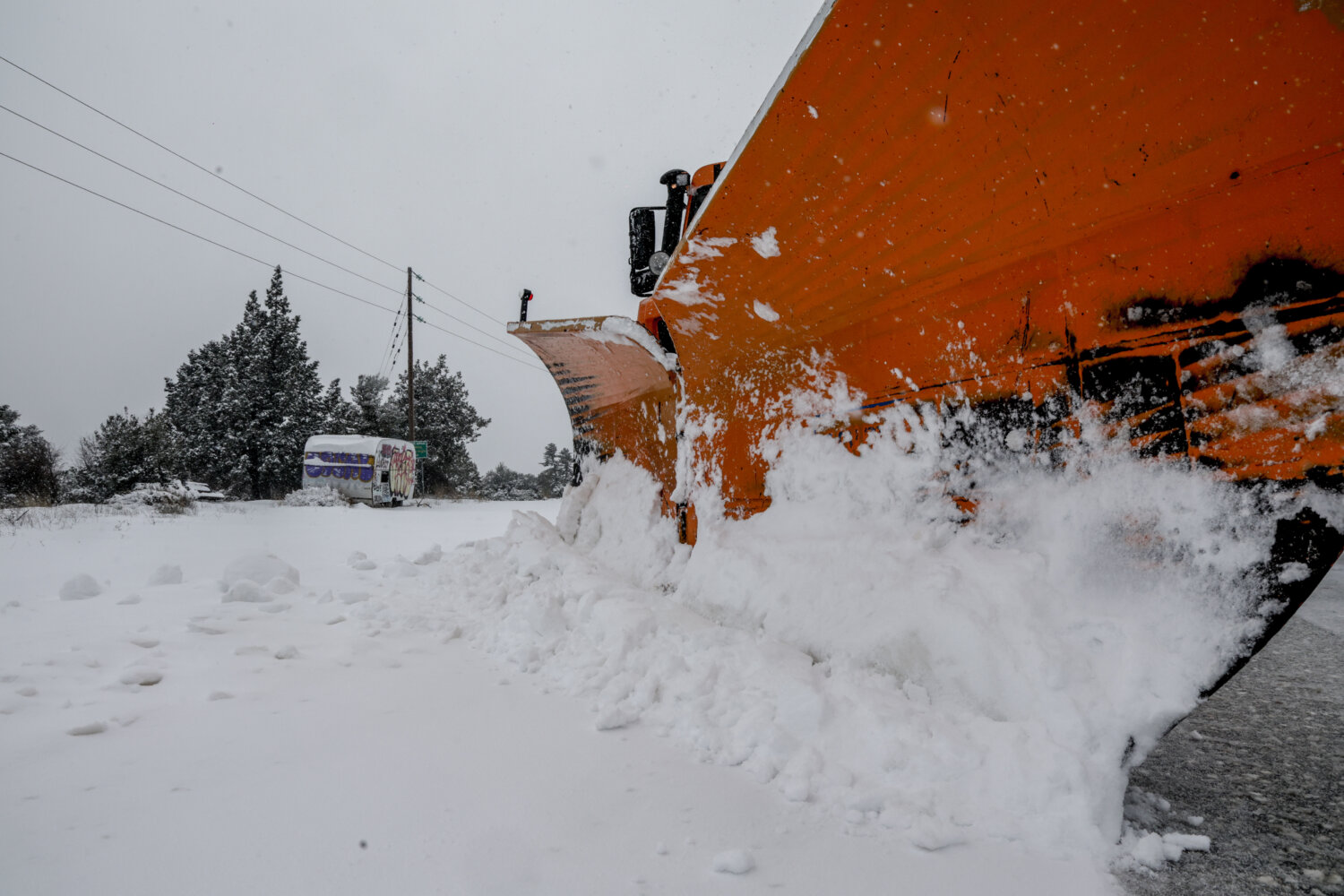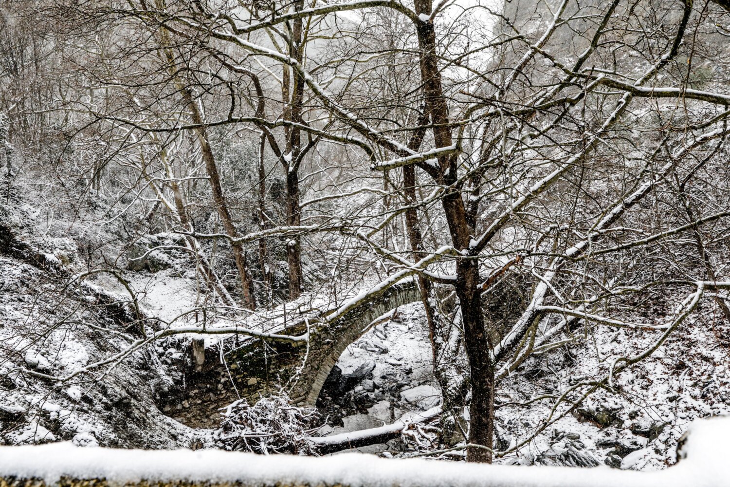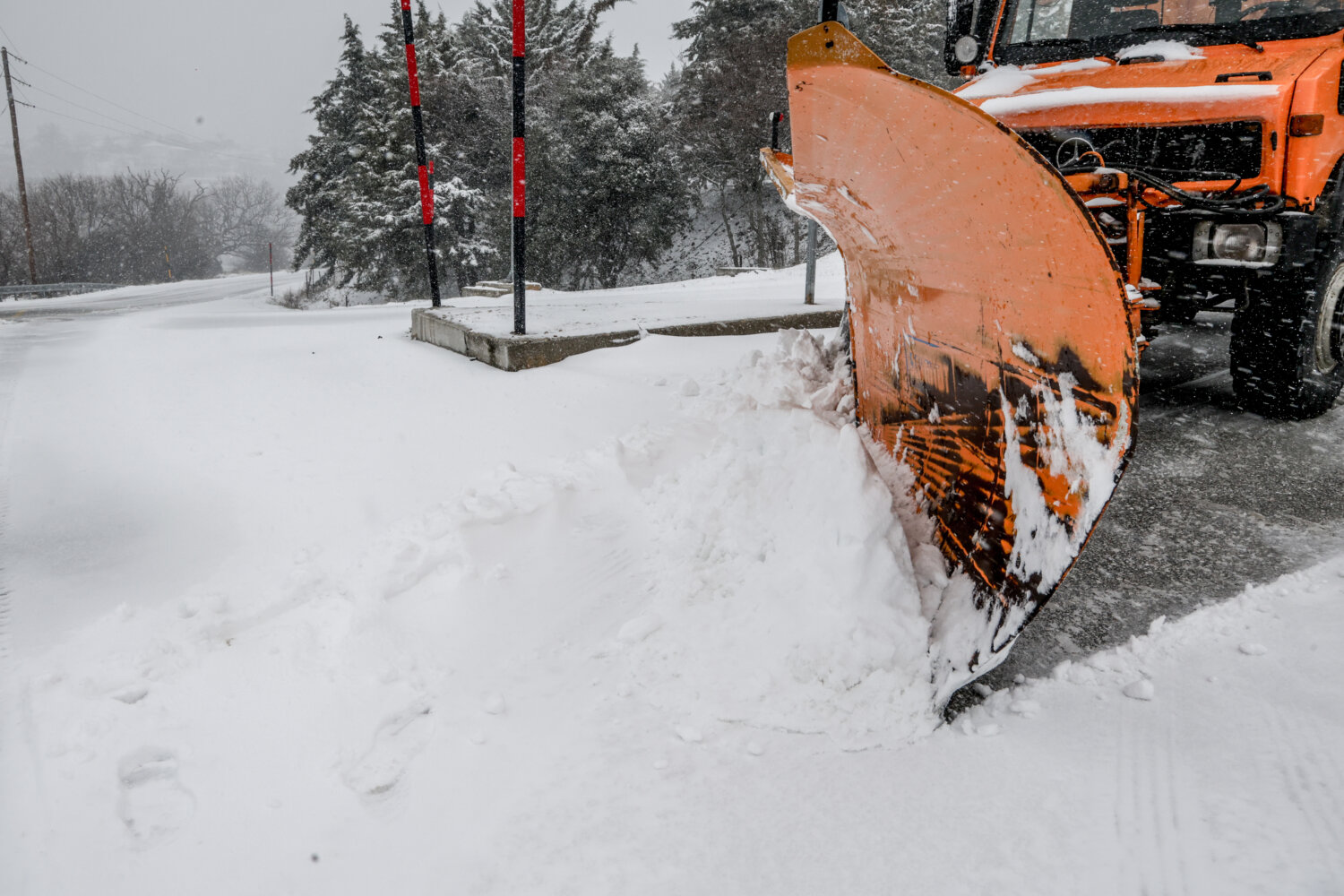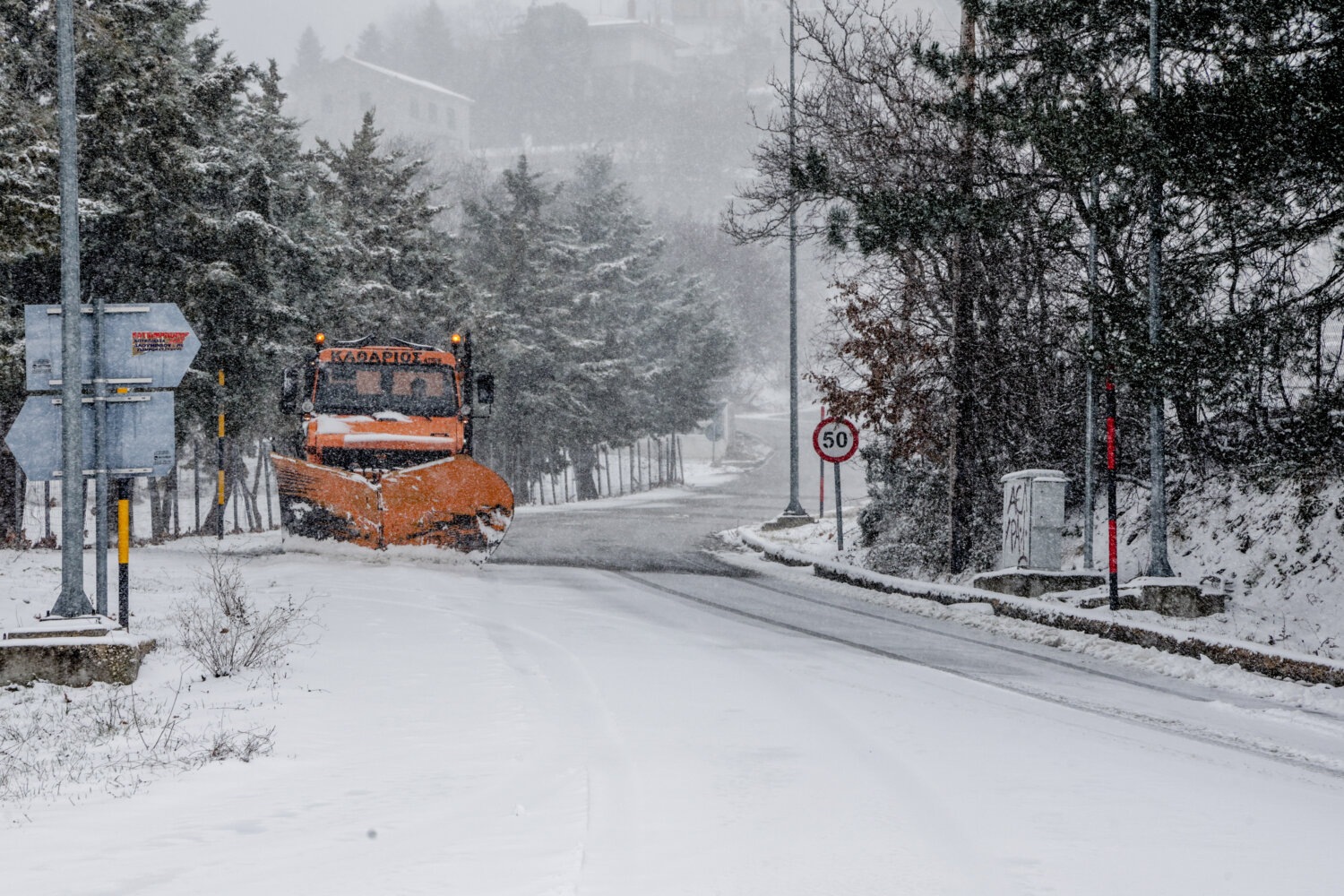 Η χιονόπτωση δημιούργησε εντυπωσιακά «ντεκόρ» στον ορεινό όγκο, τη στιγμή που τα εκχιονιστικά μηχανήματα δίνουν τη δική τους «μάχη» για να κρατήσουν ανοικτούς τους δρόμους.