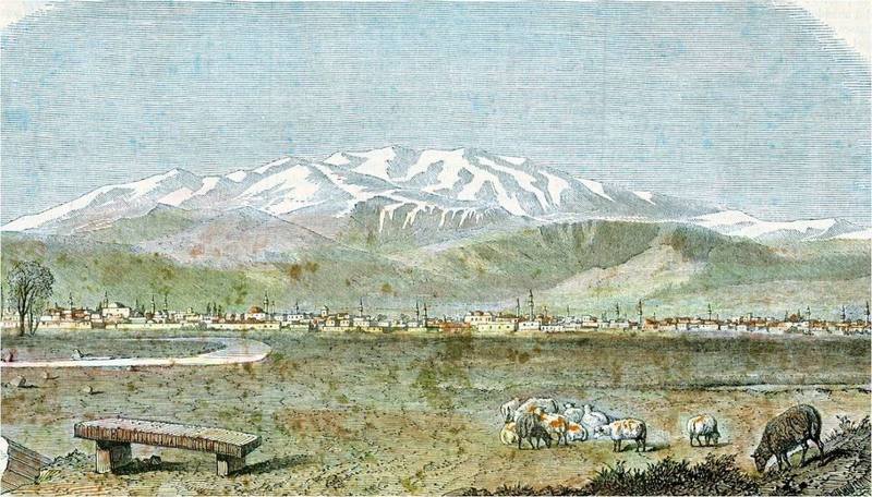 Η Λάρισα από μακρινή απόσταση με φόντο τον χιονισμένο Όλυμπο. Επιχρωματισμένο χαρακτικό από γαλλικό περιοδικό του 1850. Έπειτα από σχολαστική ανάλυση μέτρησα 22 μιναρέδες.