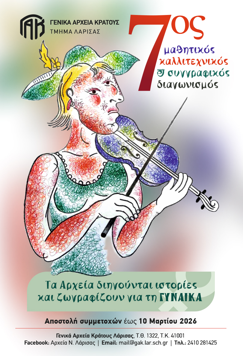 Ο 7ος μαθητικός καλλιτεχνικός και συγγραφικός διαγωνισμός των Γενικών Αρχείων Λάρισας θα τιμήσει φέτος τη Γυναίκα. Οι αναζητήσεις στο αρχειακό υλικό έφεραν στο φως στιγμιότυπα ζωής και δράσεις γυναικών που αξίζει να αναδειχθούν.
