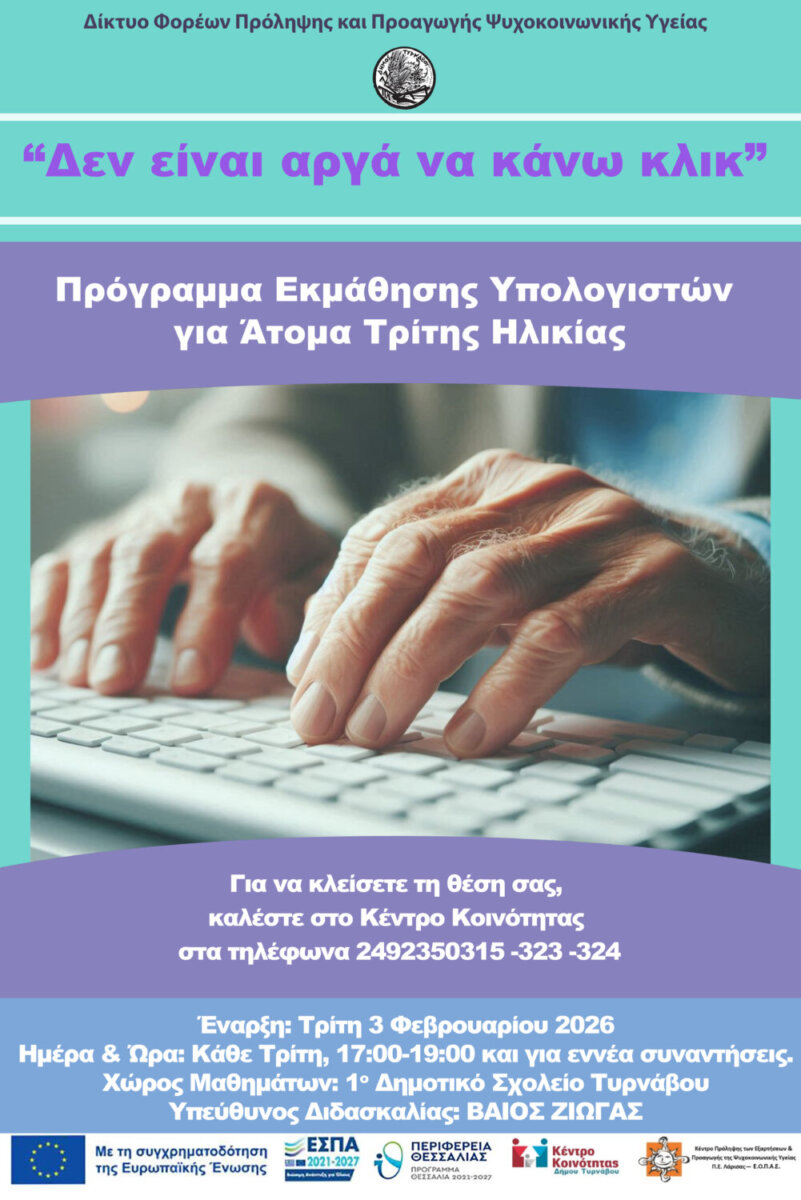 Στο πλαίσιο δράσης του Δικτύου Φορέων Πρόληψης και Προαγωγής Ψυχοκοινωνικής Υγείας, το Κέντρο Κοινότητας Δήμου Τυρνάβου σε συνεργασία με τον Εκπαιδευτικό του 1ου Δημοτικού Σχολείου Τυρνάβου κ. Βάιο Ζιώγα διοργανώνουν ομάδα εκμάθησης Η/Υ σε ηλικιωμένους, στον Τύρναβο με τίτλο: