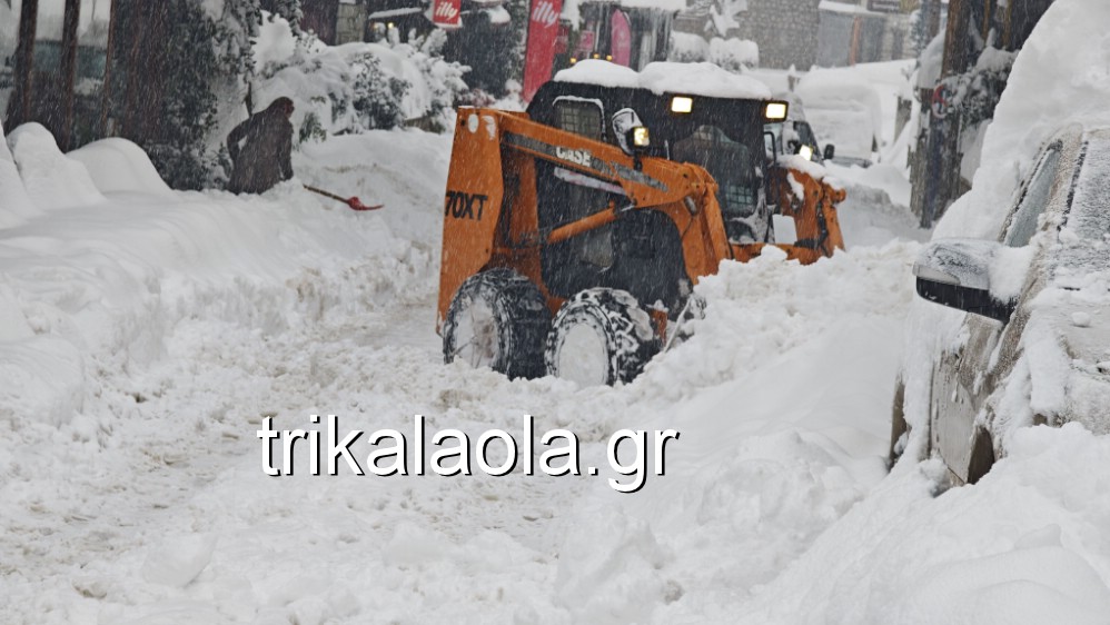 Παρόλο που τα εκχιονιστικά μηχανήματα της Περιφέρειας Θεσσαλίας περνούσαν συνεχώς από τα Τρίκαλα, το χιόνι στην Ελάτη είναι τόσο πυκνό που το ξαναέστρωνε αμέσως.