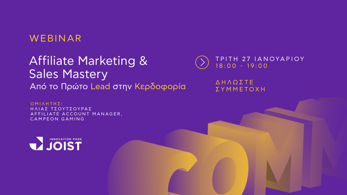 Το JOIST Community διοργανώνει ένα δωρεάν online webinar με θέμα το Affiliate Marketing και τις σύγχρονες στρατηγικές πωλήσεων, την Τρίτη 27 Ιανουαρίου 2027, από τις 18:00 έως τις 19:00.