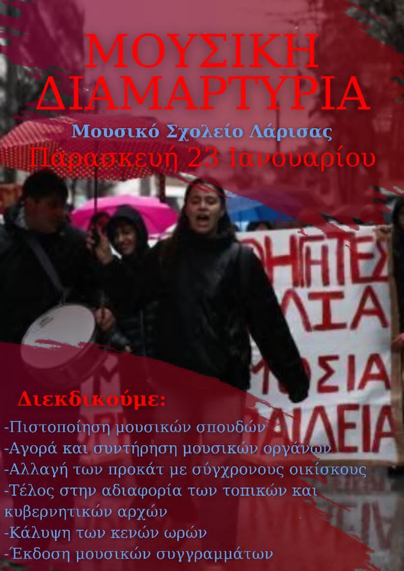 «Οι μαθητές του Μουσικού Σχολείου Λάρισας μαζί με τους καθηγητές και τους γονείς μας βγαίνουμε στους δρόμους για να διεκδικήσουμε τα αυτονόητα: ασφαλείς υποδομές, σύγχρονη και δωρεάν μουσική παιδεία και ενίσχυση των μουσικο-καλλιτεχνικών σχολείων, ώστε να συνεχίσουν να αποτελούν βασικές κοιτίδες πολιτισμού.