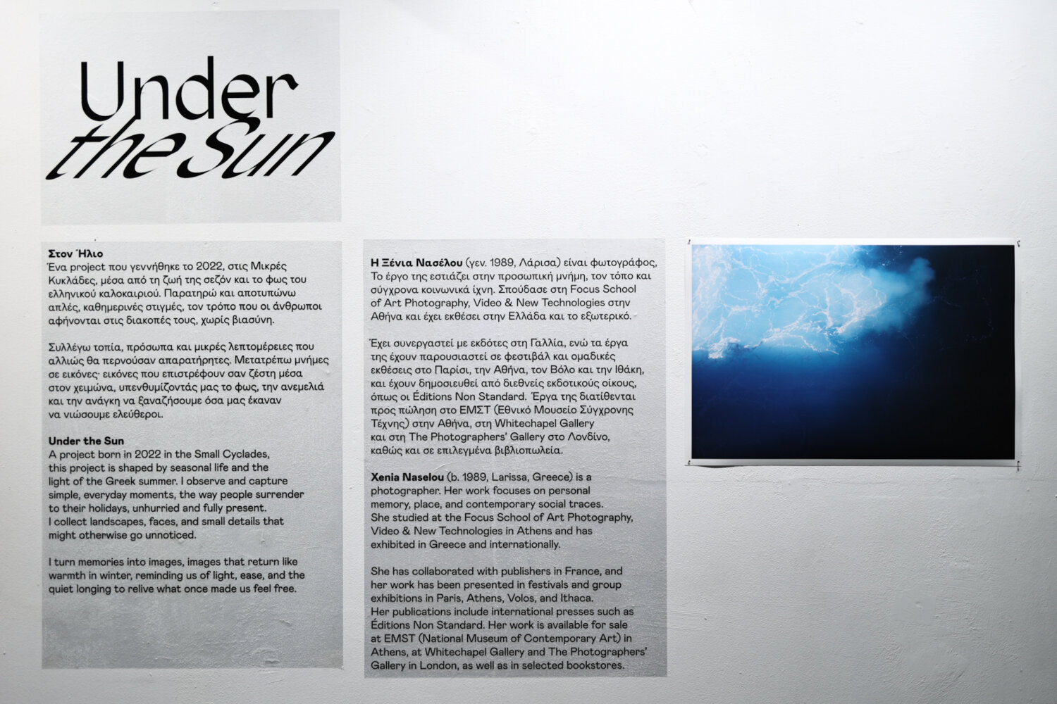 Πραγματοποιήθηκαν το απόγευμα της Παρασκευής τα εγκαίνια της φωτογραφικής έκθεσης Under the Sun / Στον Ήλιο της Ξένιας Νασέλου, στον χώρο του Wisedog στη Λάρισα. Η έκθεση, που θα διαρκέσει έως τις 8 Φεβρουαρίου 2026, παρουσιάζει ένα φωτογραφικό project που γεννήθηκε το 2022 στις Μικρές Κυκλάδες και αντλεί έμπνευση από τη ζωή της σεζόν και το φως του ελληνικού καλοκαιριού.