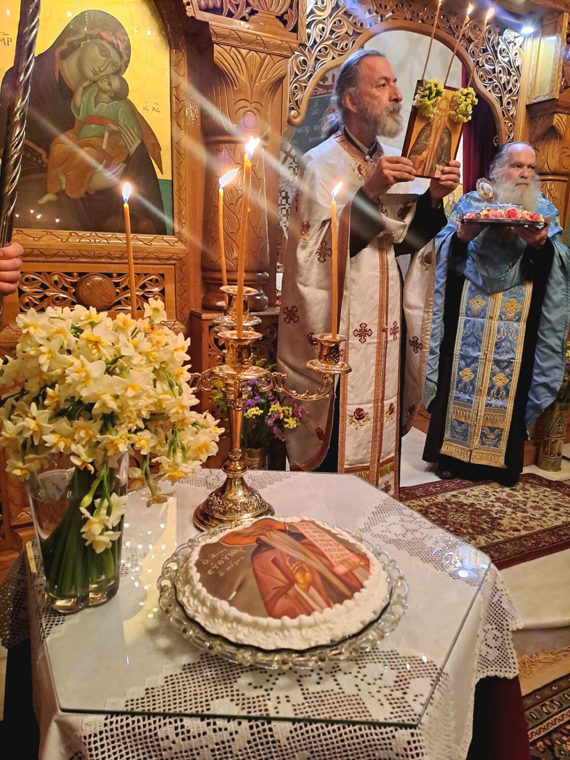 Η ατμόσφαιρα εντός του Ιερού Ναού ήταν ιδιαιτέρως κατανυκτική, με τους πατέρες και τους καλλικέλαδους ιεροψάλτες να αποδίδουν με ευλάβεια τους θρησκευτικούς ύμνους. Κατά τη διάρκεια του Εσπερινού τέθηκε σε προσκύνημα τμήμα Ιερού Λειψάνου, προς ευλογία των πιστών.
