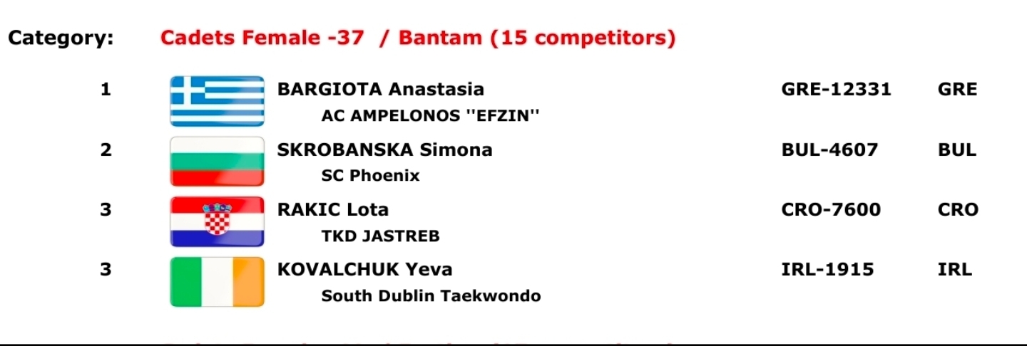 Σημαντική διεθνής επιτυχία για τον Σύλλογο Ταεκβοντό «ΕΥΖΗΝ» Αμπελώνα, με την Αναστασία Μπαργιώτα να κατακτά την 1η θέση και το χρυσό μετάλλιο, στην κατηγορία κορασίδων -37 kg, στο E3 Rank Tournament – Zaprešić Noble Taekwondo Championship, που διεξήχθη στο Ζάγκρεμπ της Κροατίας.