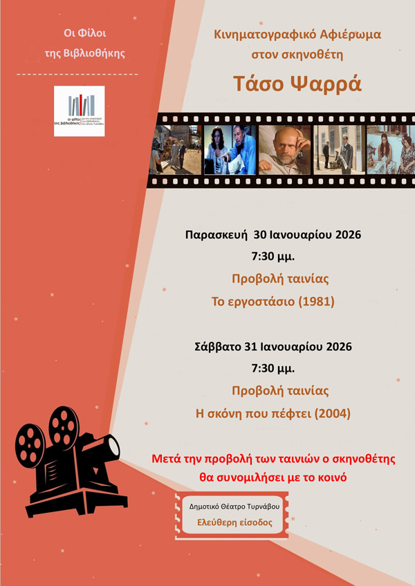 Οι Φίλοι της Βιβλιοθήκης διοργανώνουν διήμερο κινηματογραφικό αφιέρωμα στον σημαντικό Έλληνα σκηνοθέτη Τάσο Ψαρρά.
