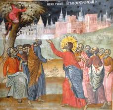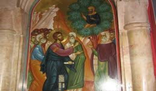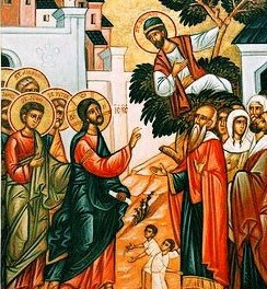ΜΙΑ ΣΥΝΑΝΤΗΣΗ: Ο Κύριος πορεύεται προς την Ιερουσαλήμ και το επακόλουθο Πάθος και περνάει μέσα από την Ιεριχώ. Ένα ετερόκλητο πλήθος αποτελούμενο από μαθητές, προσκυνητές, περίεργους, εχθρούς και φίλους τον περιβάλλει. Η προσδοκία αυτού του λαού είναι η αναμονή γι΄ Αυτόν που θα ανέβει στο θρόνο της μεσσιανικής δόξας, για να αποκαταστήσει μία … κοσμική βασιλεία και να τους δικαιώσει ως έθνος. Άλλοι, όπως οι Φαρισαίοι, περιμένουν την αφορμή να τον πειράξουν και να Τον μειώσουν, ενώ πολλοί από περιέργεια βρίσκονται δίπλα Του για να δουν τέρατα και σημεία. Άνθρωποι θρησκευόμενοι και μη, οπωσδήποτε όμως Ισραηλίτες, που αυτο-θεωρούνται θρησκευτικώς καθαροί και άψογοι. Μέσα στους καθαρούς ξεπροβάλλει η μορφή ενός «ακαθάρτου». Είναι ο Ζακχαίος που ζει με συκοφαντίες, κλοπές, καταπίεση των άλλων. Αυτός ο δακτυλοδεικτούμενος, ανεβαίνει σε μια συκομουριά να δει τον Κύριο, γιατί ήταν κοντός. Αδιαφορεί για την κοινωνική του θέση, τους ψιθύρους, την αποδοκιμασία των λεγομένων »δικαίων είναι» και επιζητεί την προσοχή και το έλεος του Σωτήρα. Σηκώνει τα μάτια ο Κύριος σε αυτή την εικόνα σιωπηλής του κραυγής για σωτηρία και τον ανταμείβει λέγοντάς του: “Ζακχαίε, σπεύσε και κατέβα, γιατί σήμερα πρέπει να μείνω στον οίκο σου». Και ο Ζακχαίος, αδιαφορώντας ταπεινά για τους γογγυσμούς των γύρω φωνάζει: »Ιδού, τα μισά των υπαρχόντων μου, Κύριε, τα δίνω στους φτωχούς, και αν κάποιον φορολόγησα κάτι παράνομα, το αποδίδω τετραπλάσια”. Και ο Κύριος ανταπαντά: “Σήμερα έγινε σωτηρία στον οίκο τούτο, καθότι και αυτός είναι γιος του Αβραάμ, γιατί ο Υιός του ανθρώπου ήρθε να ζητήσει και να σώσει το χαμένο”.