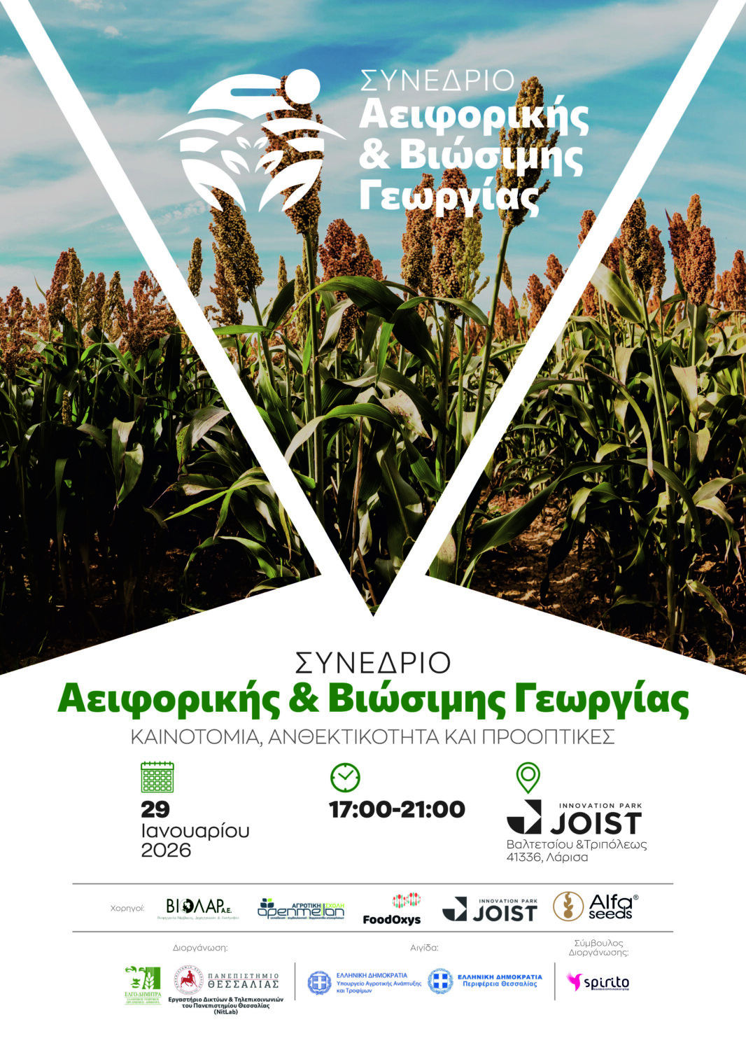 Στο πλαίσιο της συνεχούς προσπάθειας για μια βιώσιμη, ανθεκτική και καινοτόμο γεωργία, , θα πραγματοποιηθεί το Συνέδριο Αειφορικής και Βιώσιμης Γεωργίας, την Πέμπτη 29 Ιανουαρίου 2026, από 17:00 έως 21:00, στον πολυχώρο JOIST (Βαλτετσίου & Τριπόλεως, Λάρισα).