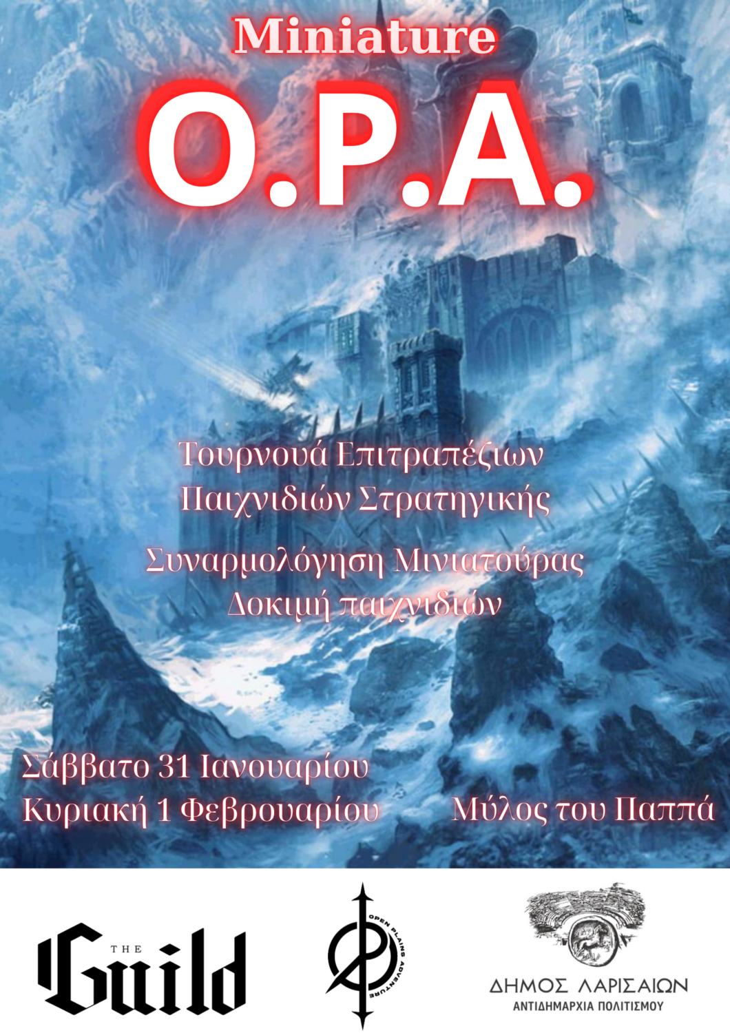 Ένα διήμερο αφιερωμένο στο παιχνίδι με μινιατούρες, το Miniature O.P.A. 2026 έρχεται για πρώτη χρονιά στη Λάρισα, το Σάββατο 31 Ιανουαρίου και την Κυριακή 1 Φεβρουαρίου 2026, στον Μύλο του Παππά, με ελεύθερη είσοδο και συμμετοχή στα παιχνίδια, από τον Ζήση Αποστολίδη και το “The Guild”, σε συνεργασία με την Αντιδημαρχία Πολιτισμού του Δήμου Λαρισαίων.