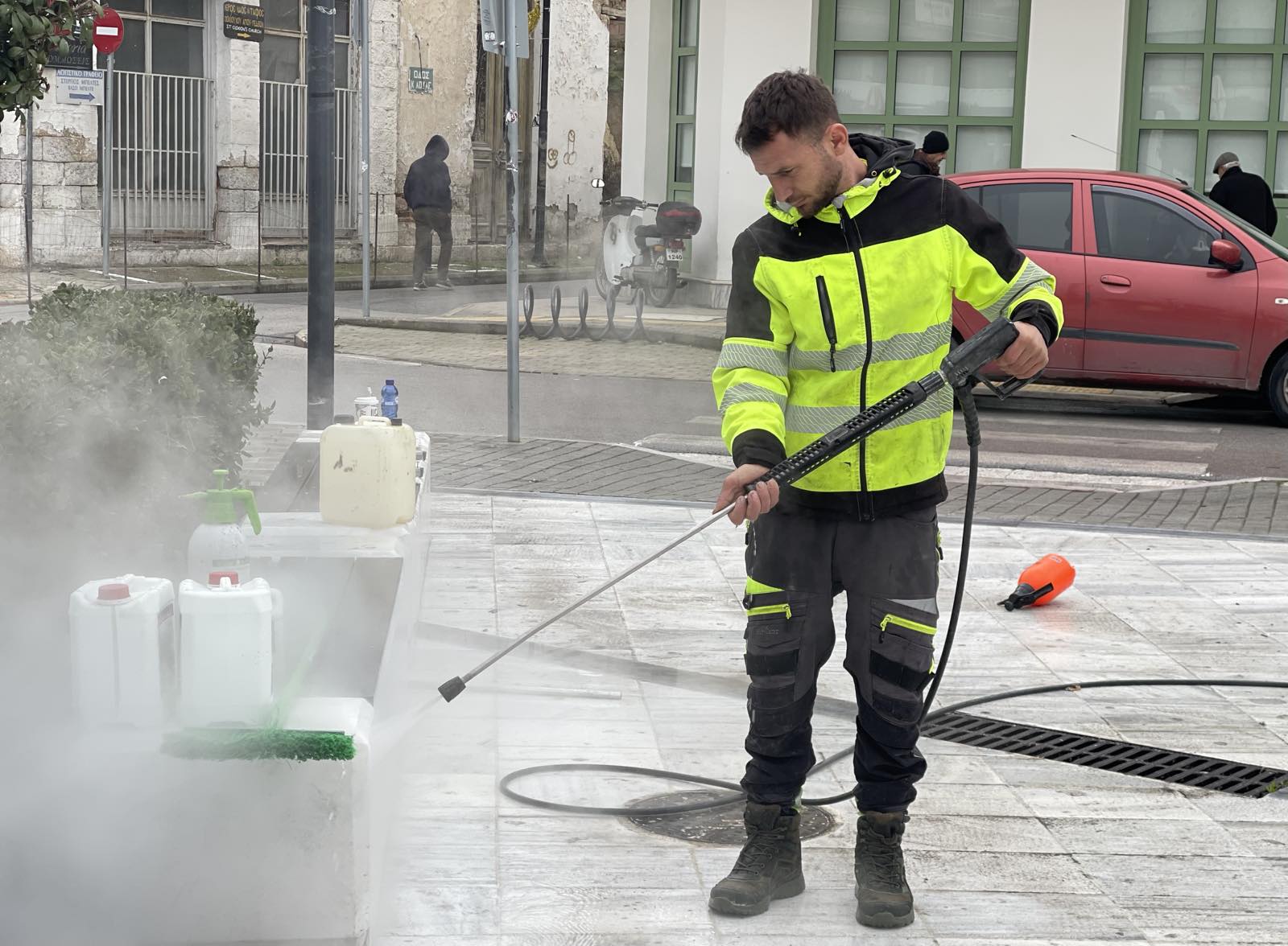 Εξειδικευμένο συνεργείο βρίσκεται στον χώρο και πραγματοποιεί καθαρισμό του μαρμάρινου δαπέδου της πλατείας με νερό υψηλής πίεσης. Οι εργασίες εξελίσσονται με γρήγορους ρυθμούς και ήδη από την πρώτη στιγμή η διαφορά είναι εμφανής, καθώς απομακρύνονται ρύποι και επίμονες εναποθέσεις που είχαν επιβαρύνει την επιφάνεια με την πάροδο του χρόνου.